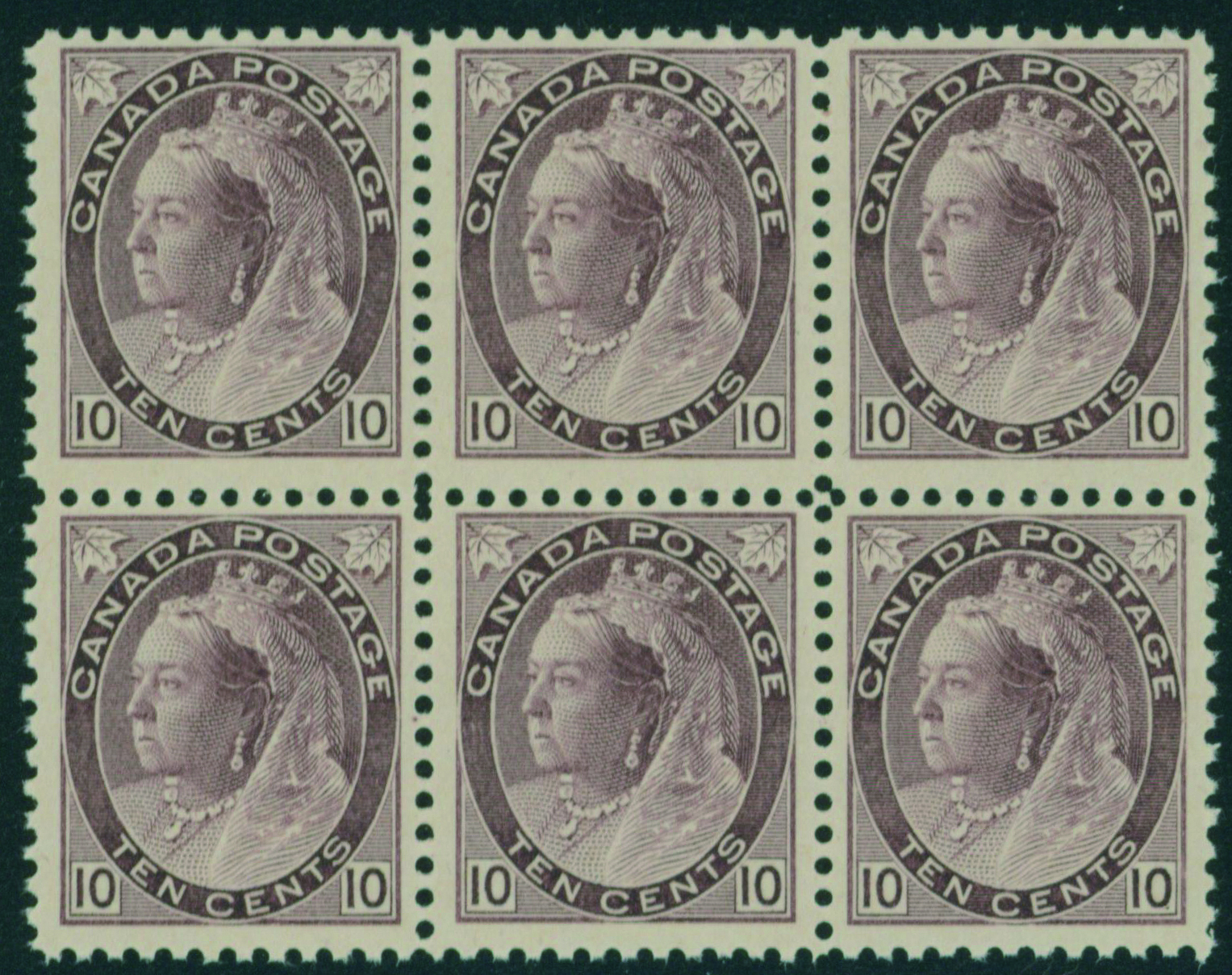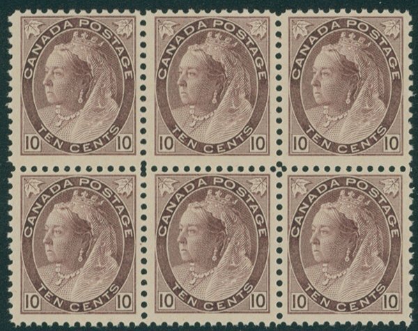 商品説明:カナダ 1898 10c block of 6 未使用 ヒンジ跡なし 裏面の一部に黒い汚れ、1枚に一部糊落ちあり カタログ価:360,000円SCOTT 83,