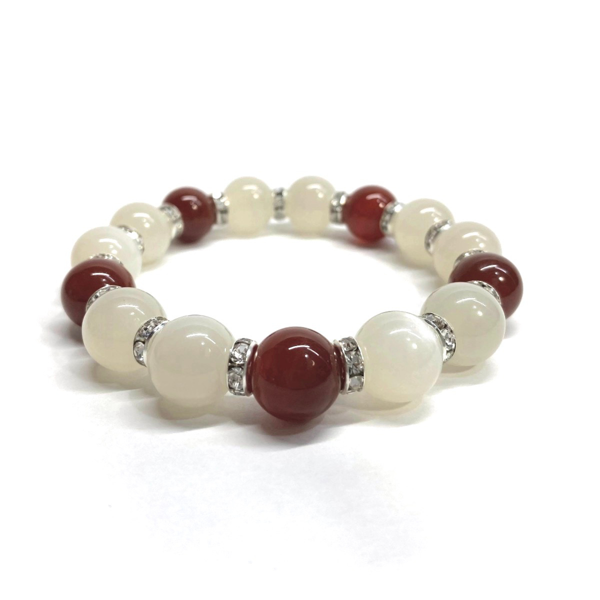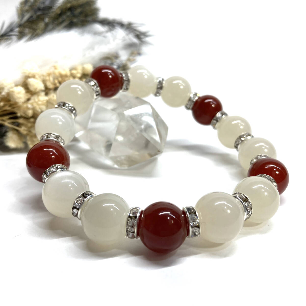 こちらは、ムーンストーンと赤瑪瑙を組み合わせたパワーストーンブレスレットです。間にはロンデルを挟み高級感あるデザインに仕上げております。程よくインパクトがある12mm玉を使用して内周約18cmです。(サイズ変更の場合は取引ナビにてご連絡をお願いします。) 数に限りがございますので気になる方はお早めにどうぞ。