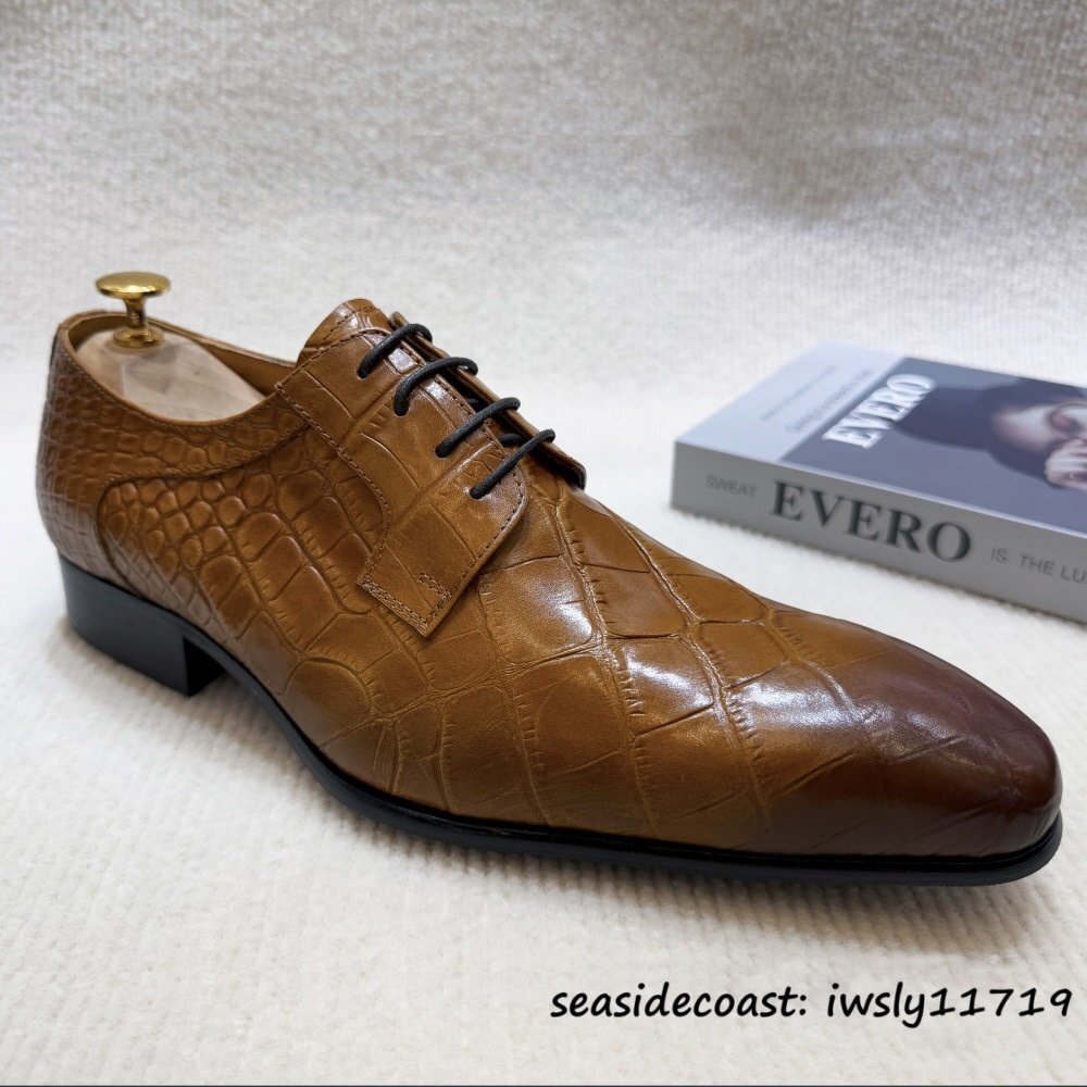 定価9万超★最高級 鰐柄ドレスシューズ 牛革 ビジネスシューズ 本革 レザーシューズ メンズ 職人手作り 紳士靴 革靴 新品 ブラウン 25.0cm