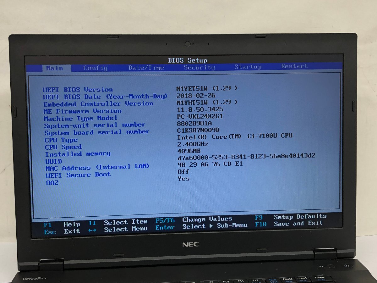 ジャンク/ NEC PC-VKL24XZG1 Intel Core i3-7100U メモリ4.1GB ストレージ無し 【K22147】