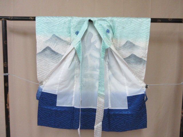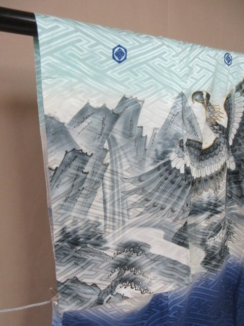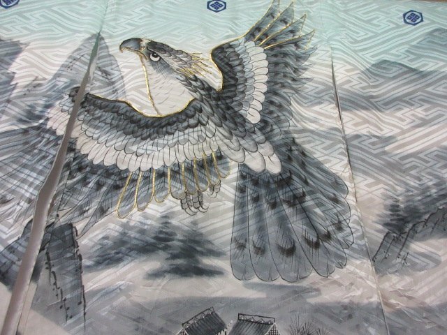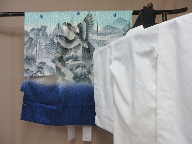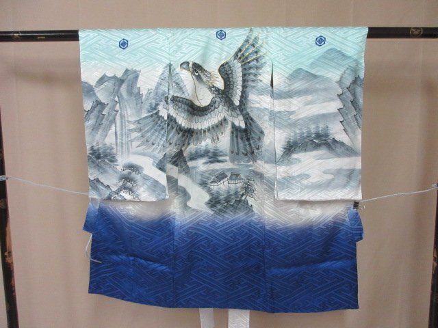商品名 | 1円 良品 正絹 男児 子供着物 縮緬 七五三 和装 和服 産着 襦袢セット 鷹 紗綾形文 遠山 高級 袷 身丈97cm【夢職】★ |