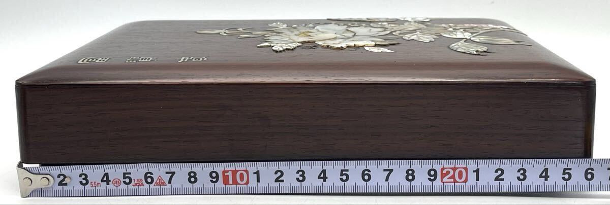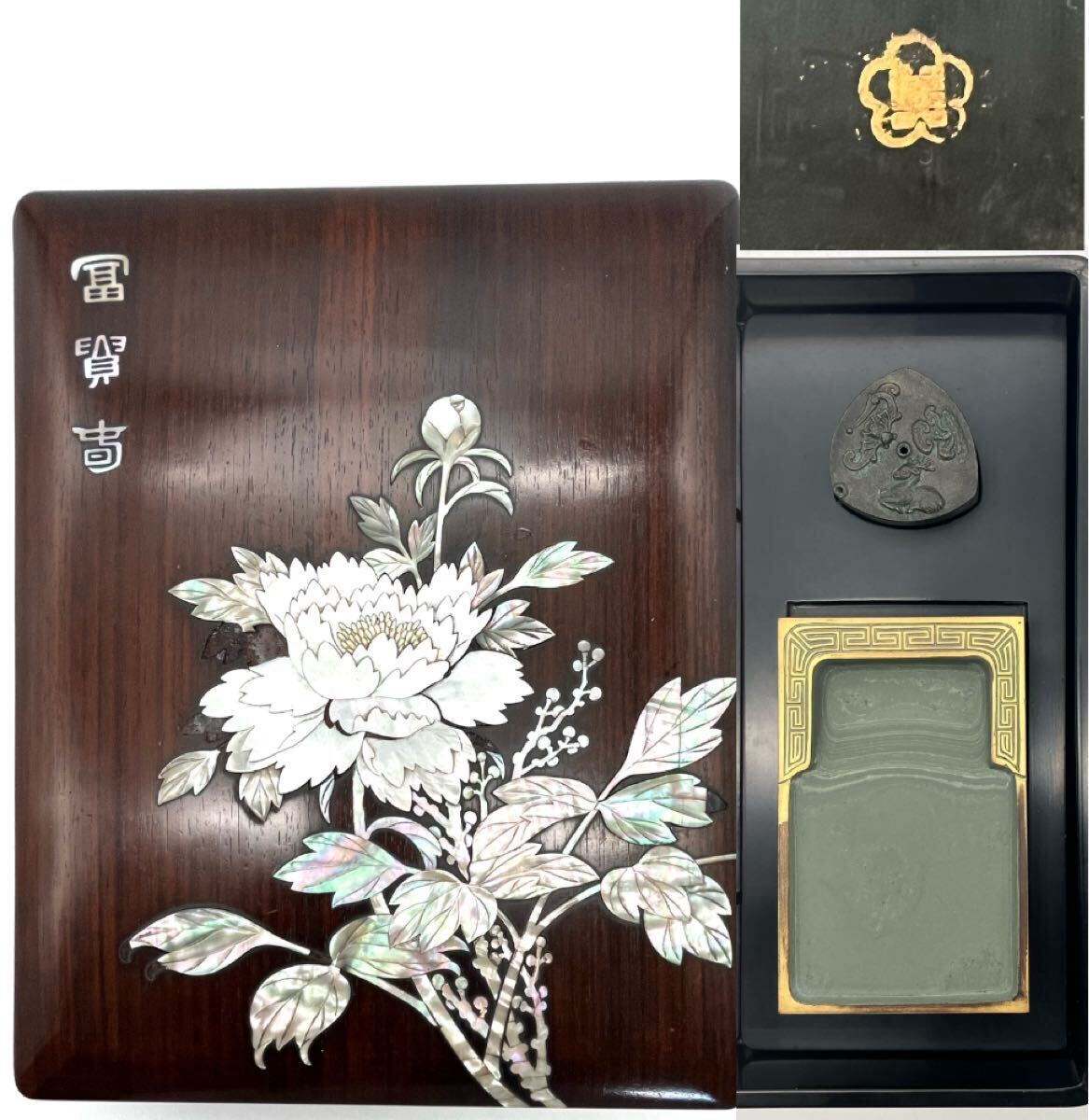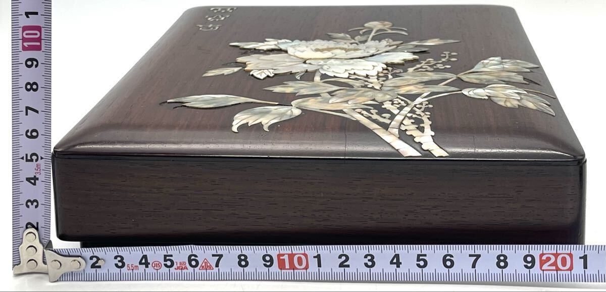 【鶴】貴重!朝鮮美術 李王家美術工場造 唐木 螺鈿 花図 硯箱 花美印 水滴 硯付 約5.5cm×21cm×26cm◯李朝・皇室・端渓・蒔絵・文房具A387