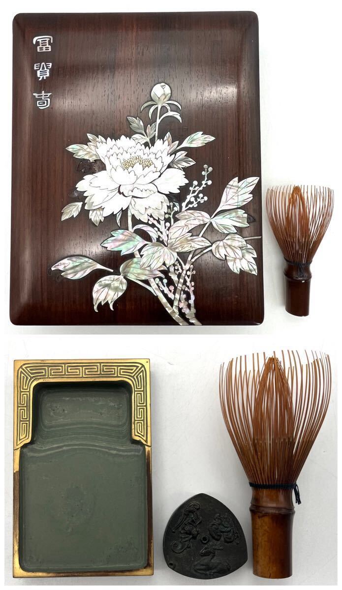 貴重!朝鮮美術 李王家美術工場造 唐木 螺鈿 花図 硯箱 花美印 水滴 硯付になります。時代やタイトルは当方の見解ですのでご了承下さい。李王家の硯箱は通常は漆製の物がほとんどですが、唐木で作られた硯箱は非常に珍しい物と思います。状態は表面の螺鈿に数カ所剥がれや、欠損している箇所があり、底面にヒビや擦り傷もございます。硯箱の中の漆の板に若干反りがあり、黒漆の小さな剥げもございます。画像を必ず確認してご自身でご判断お願い致します。経年による使用感はあるとお考え頂き、神経質なお客様のご入札はお控え下さい。傷等はチェックしておりますが、見落とし等の可能性もございますので、画像にてご確認の上、気にならないお客様のみご入札お願い致します。