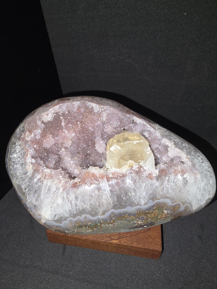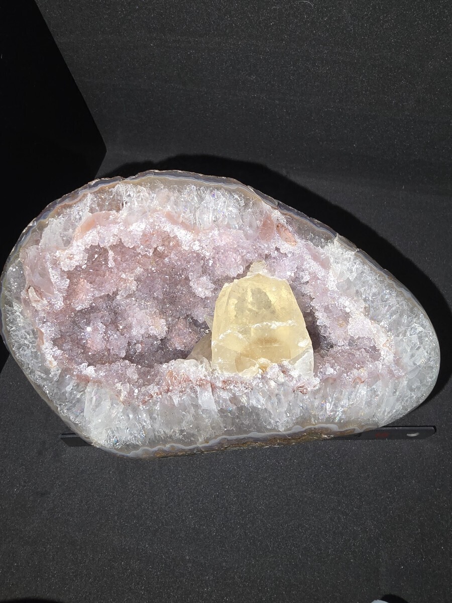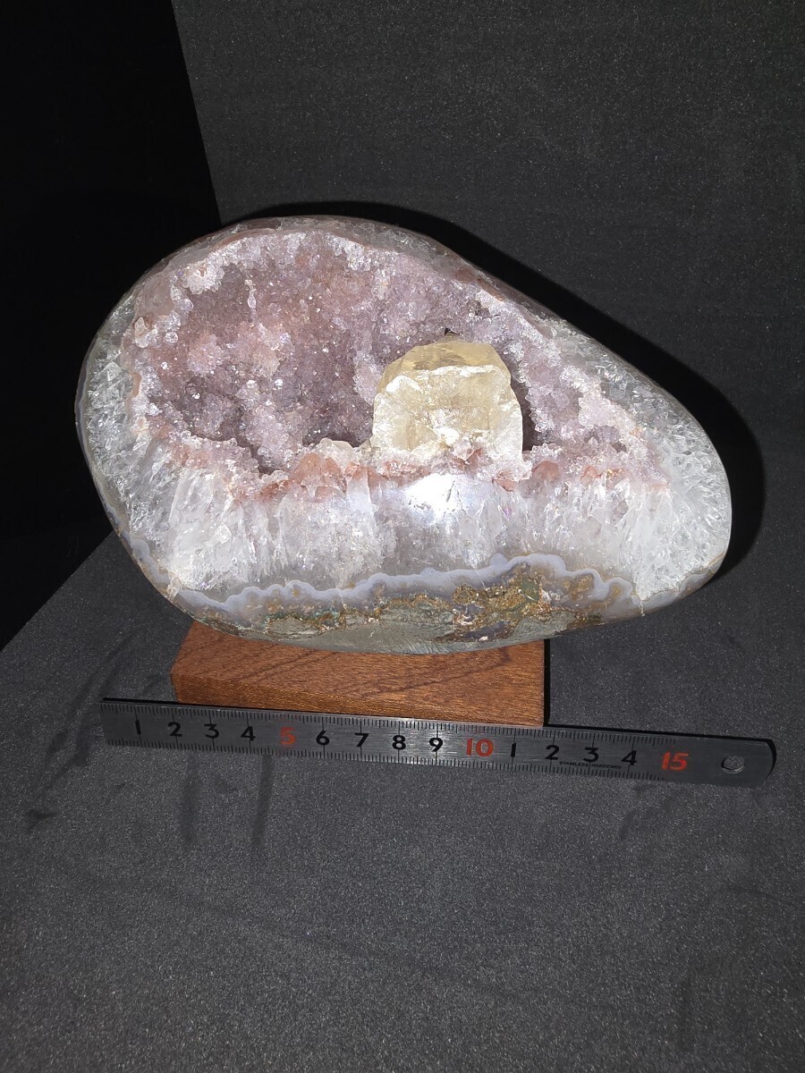 この商品は、とても珍しい天然石アメジストとカルサイトのジオードです。内部に美しい紫色のアメジスト結晶がぎっしり詰まっており、中心には目立つレモン色のカルサイトが存在します。石英の外壁は自然の形を保ちながら、ポリッシュされて輝いています。
