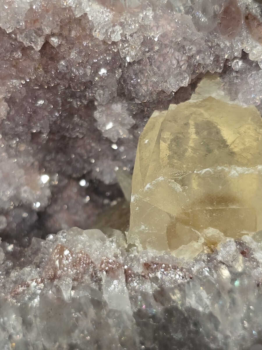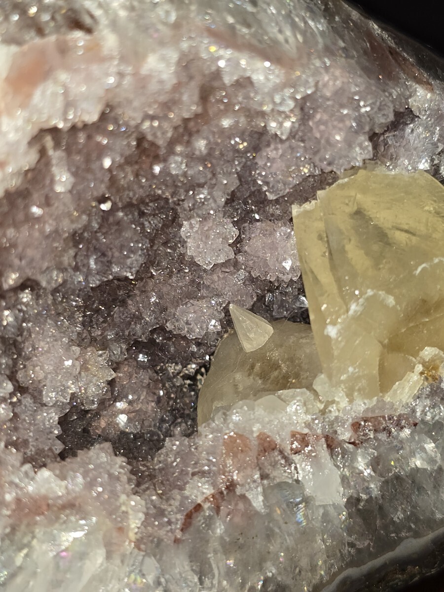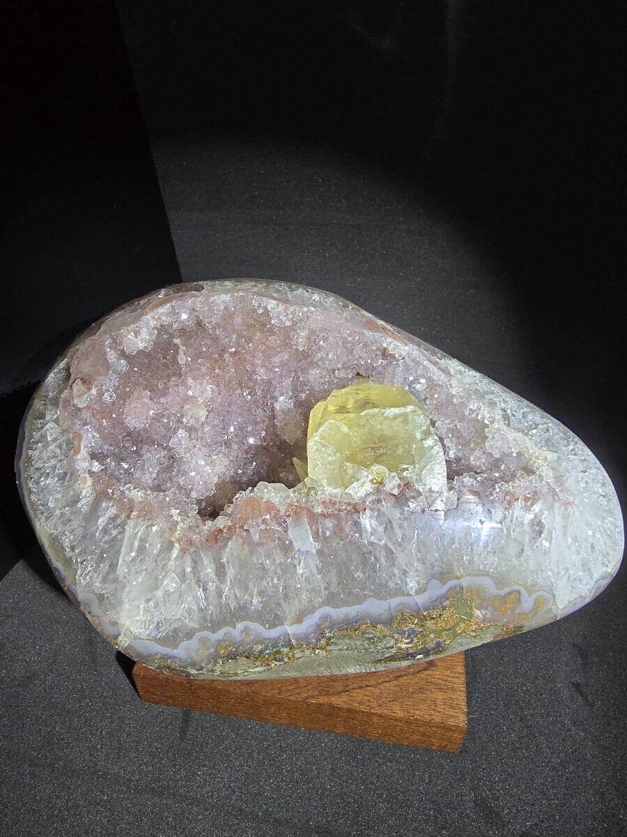 この商品は、とても珍しい天然石アメジストとカルサイトのジオードです。内部に美しい紫色のアメジスト結晶がぎっしり詰まっており、中心には目立つレモン色のカルサイトが存在します。石英の外壁は自然の形を保ちながら、ポリッシュされて輝いています。
