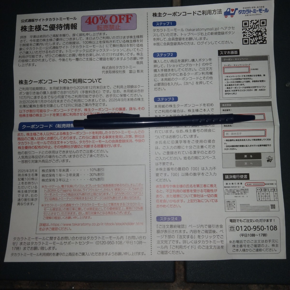 タカラトミーモールで利用可能。内容ご存知の方だけ宜しくお願い致します。コード番号、株主名、株主番号をお知らせします。 優待券の発送はしません。 必ず使用可能か確認後に受け取りボタンを押してください。