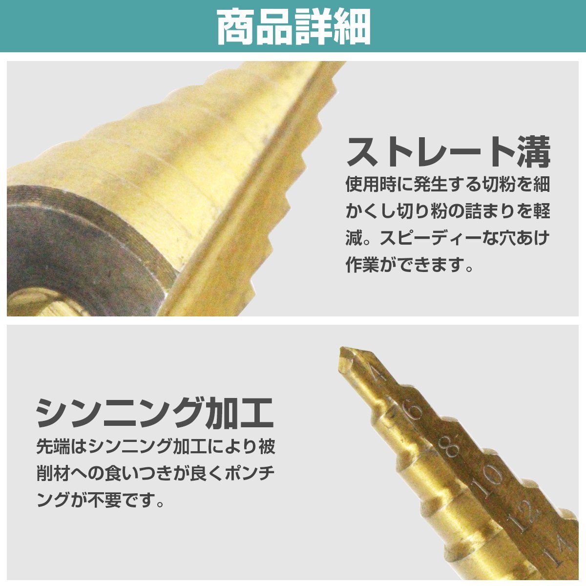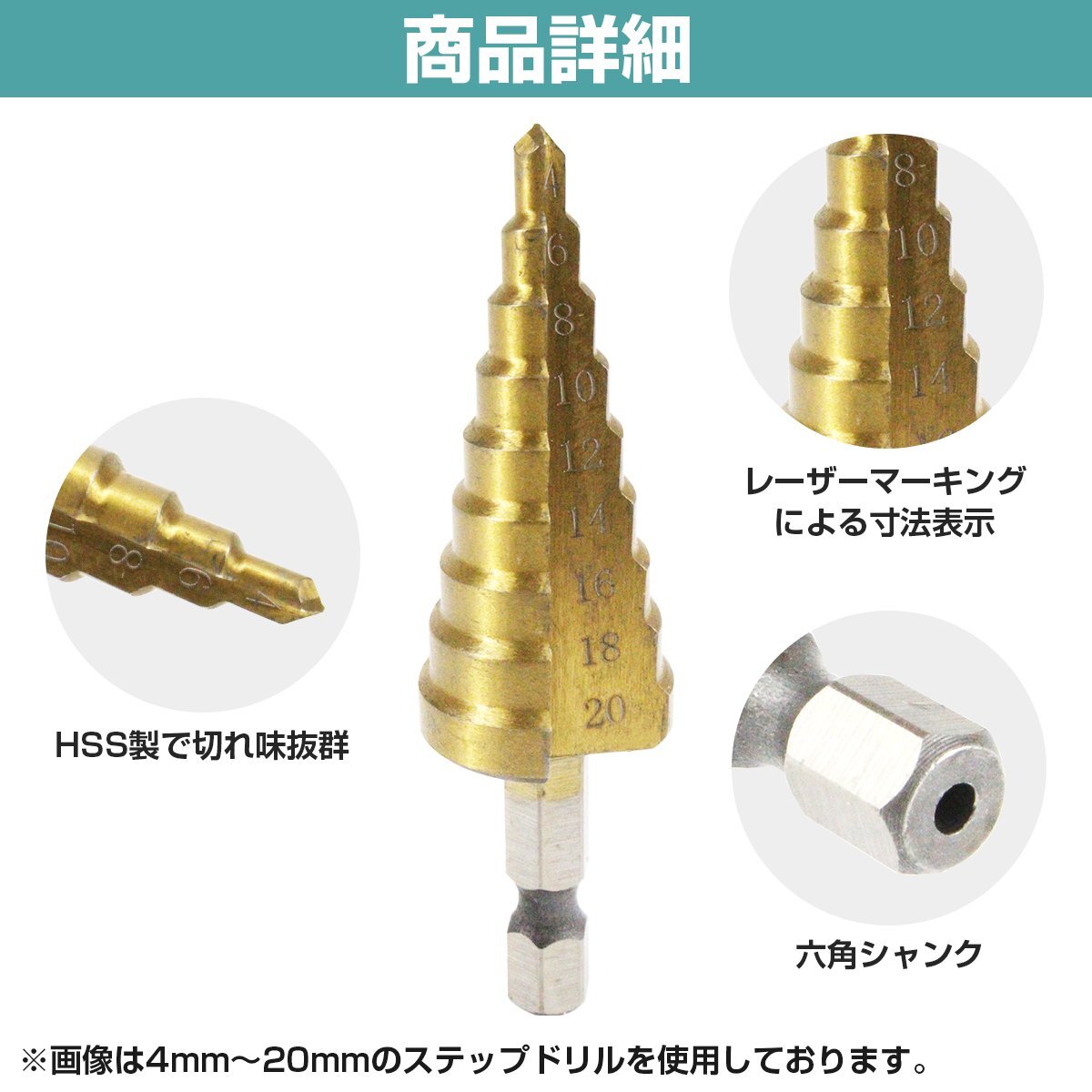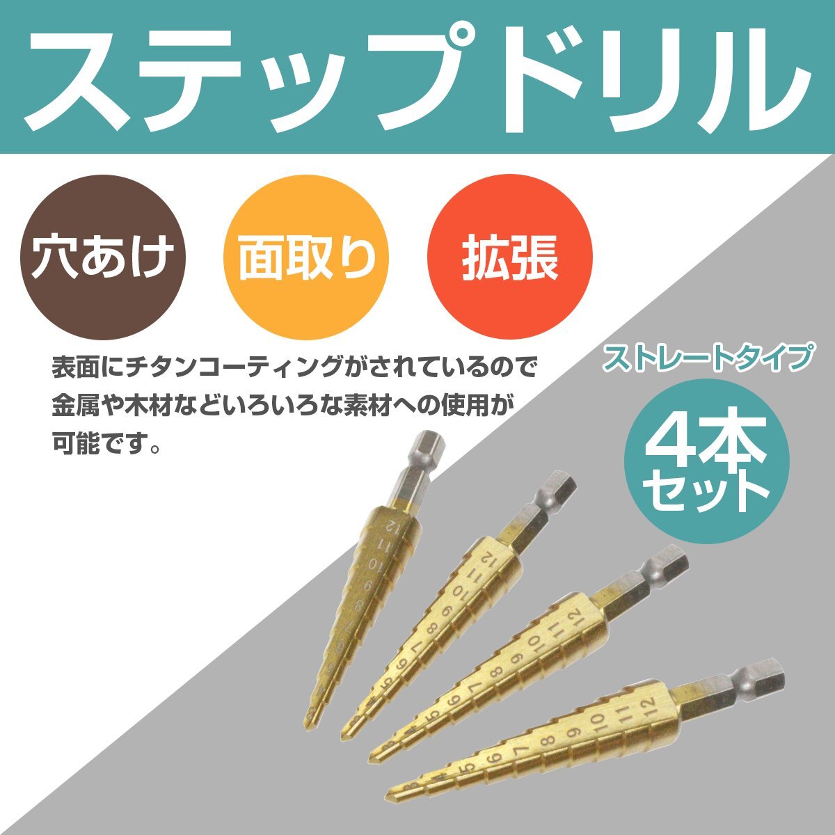商 品 説 明HSS鋼チタンコーティングのステップドリル4本セットです。