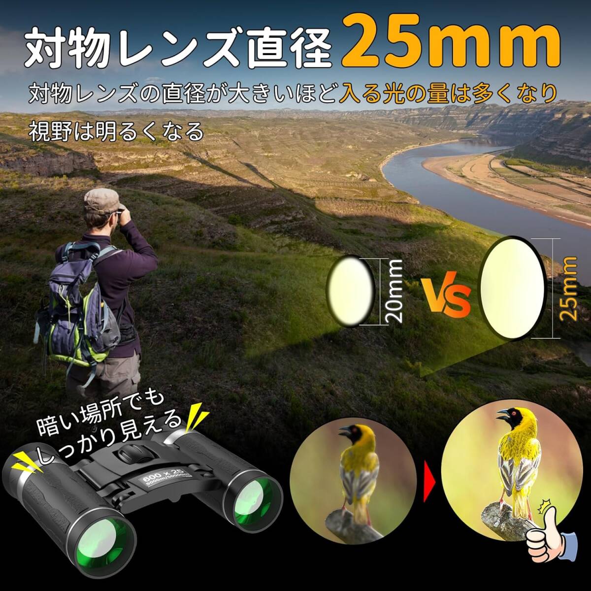 | 【10*25鮮明に見やすさ】双眼鏡 ライブ用は10倍のズームを備えており、コンサートやスポーツ観戦、野鳥観察などに最適です。お気に入りのアーティストや選手、鳥の全身を視界に捉え、楽しさが倍増します! 【しっかり見える】双眼鏡は最新の先端光学技術により、99%の透過率を達成しました。高い集光力と明るい画像を実現しています。業界最先端のBAK4光学レンズとFMC多層グリーンフィルムコーティングにより、反射を抑え、より鮮明な視界を提供します。 【超軽量&コンパクト】双眼鏡 ライブ用はコンサートに最適な超コンパクトなダハプリズム式双眼鏡です。折りたたむとさらにコンパクトになり、バッグに楽々収納できます。 【日本人向けに設計】眼幅は33~75mmの広い調整幅で設計されており、顔の小さな女性や子供でもしっかり調整が可能です。さらに、大きめの見口設計で、まつ毛の長い方でもストレスなく使用できます。 【使用方法】1.自分の瞳の間隔に合わせて接眼レンズの幅を調整します。左右の視野(円形)が一つの円になれば調整完了です。 2.目標物を決め、まず左目だけでのぞき、ピント合わせリングを回してピントを合わせます。 3.同じ目標物を右目だけでのぞき、視度調整リングを回してピントを合わせます。M59 Z |