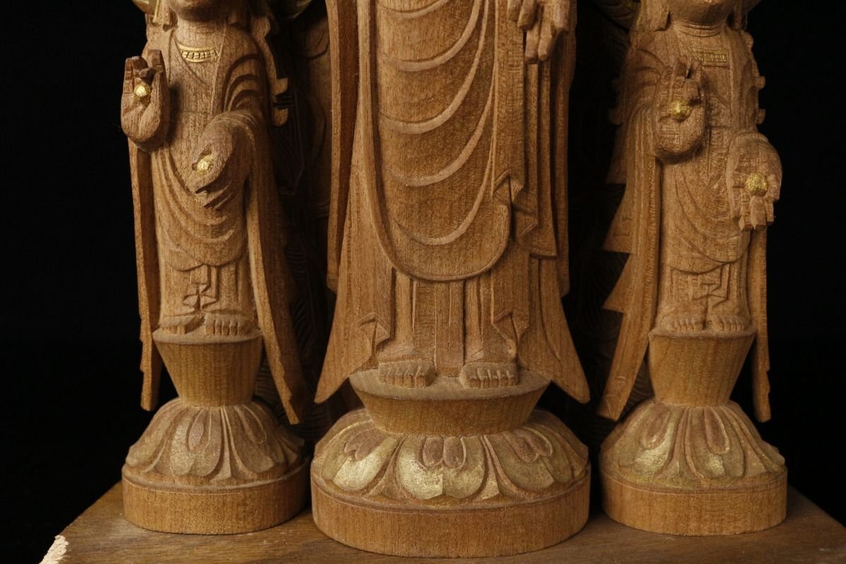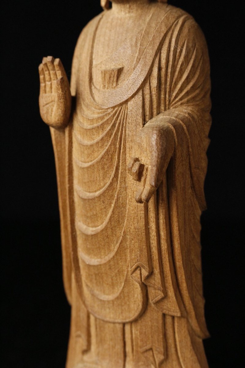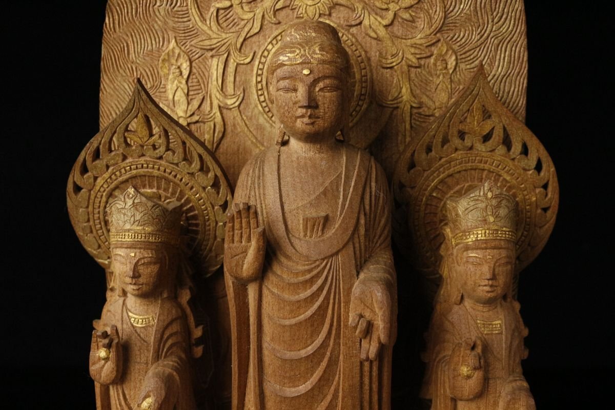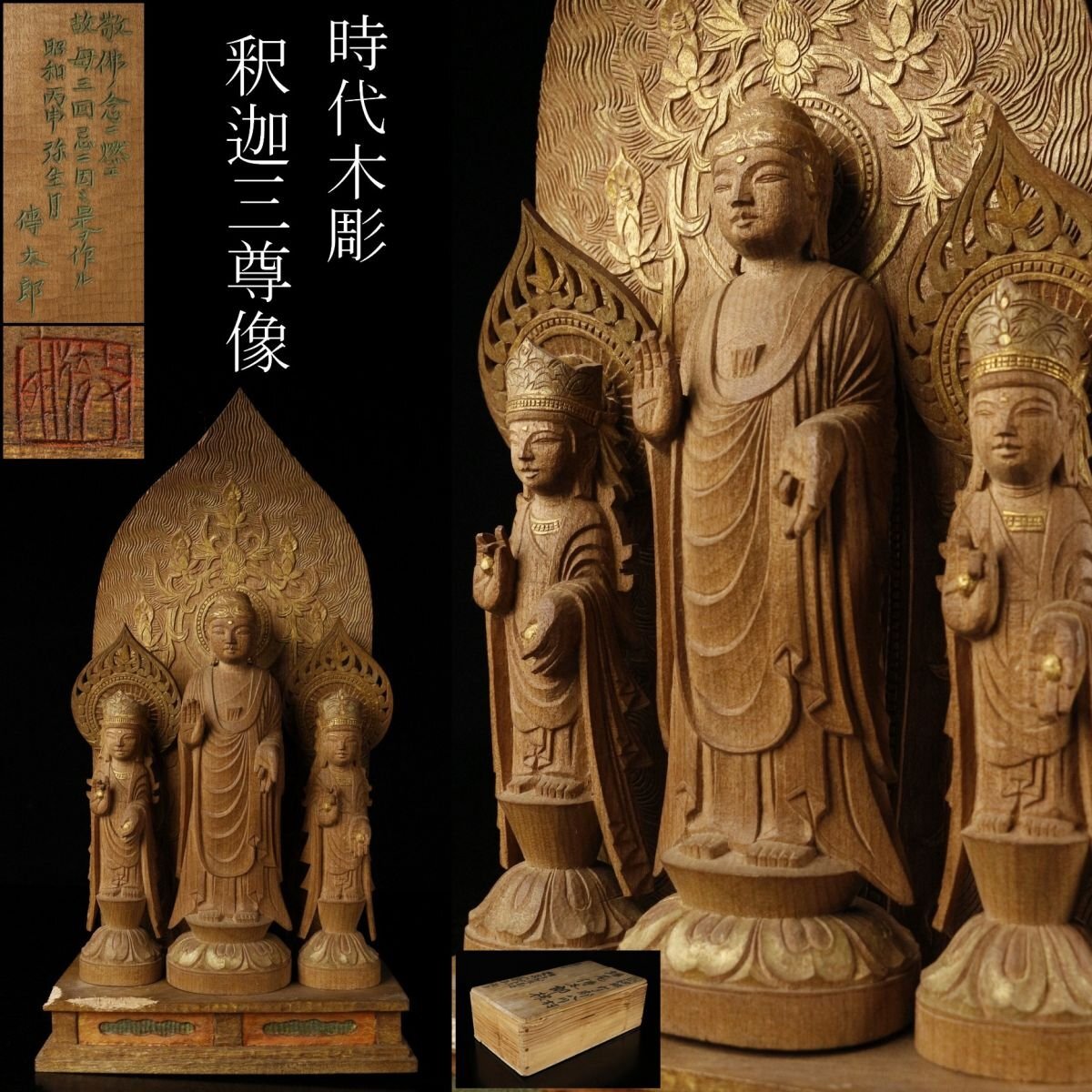 * * * 商品詳細 * * * ここでしか出逢うことのできない唯一の美をご紹介させて頂きます。 素朴でどこか愛嬌が感じられるお顔に佇まいをした釈迦三尊像のご紹介です。 経年を経た肌地は味があり、温かみのある柔らかな手触りと美しい木肌も魅力的です。 大切に扱われてきたことが伺える 深い祈りに包まれた時代感のある逸品です。 ■商品内容/三尊仏、台座、箱 ■サイズ/仏像:横6㎝×高18.5㎝×奥行5.5㎝(最大) 台座:横16.5㎝×高3㎝×奥行8.5㎝ 箱:横20.5㎝×高12㎝×奥行33.5㎝ ■状態/スレ、キズ、剥げ、パーツ欠損、台座にスレ、キズ、欠け、 箱にキズ、浮き、欠け、ヒビ、割れ、サビ、蓋に割れ等傷みがございます。 ※写真にてご確認、ご了承の上ご入札下さい。