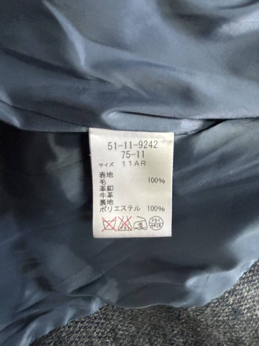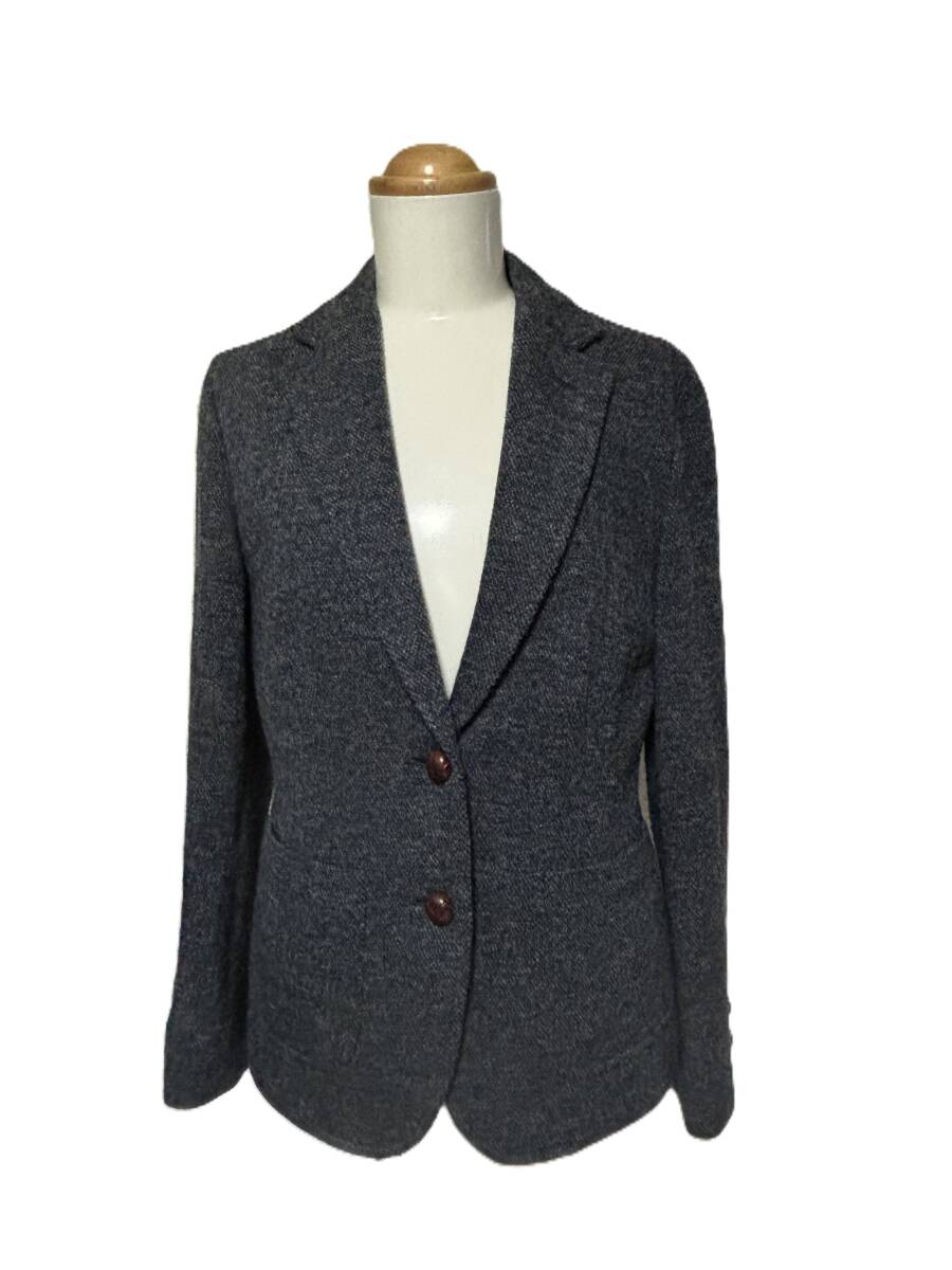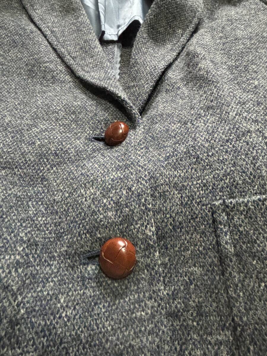 ■ 特徴:ウール100%のツイード生地の高級感あふれるジャケット。革ボタンが素敵です。グレーとネイビーの間のような色味です。秋冬用