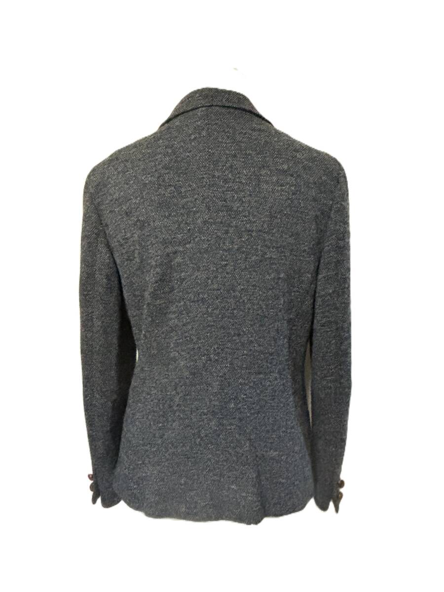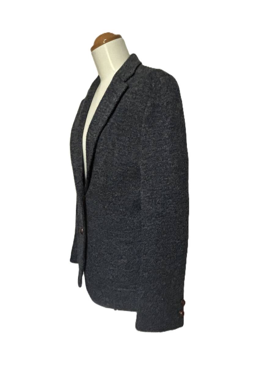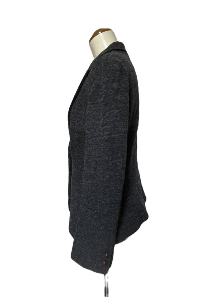 ■ 特徴:ウール100%のツイード生地の高級感あふれるジャケット。革ボタンが素敵です。グレーとネイビーの間のような色味です。秋冬用