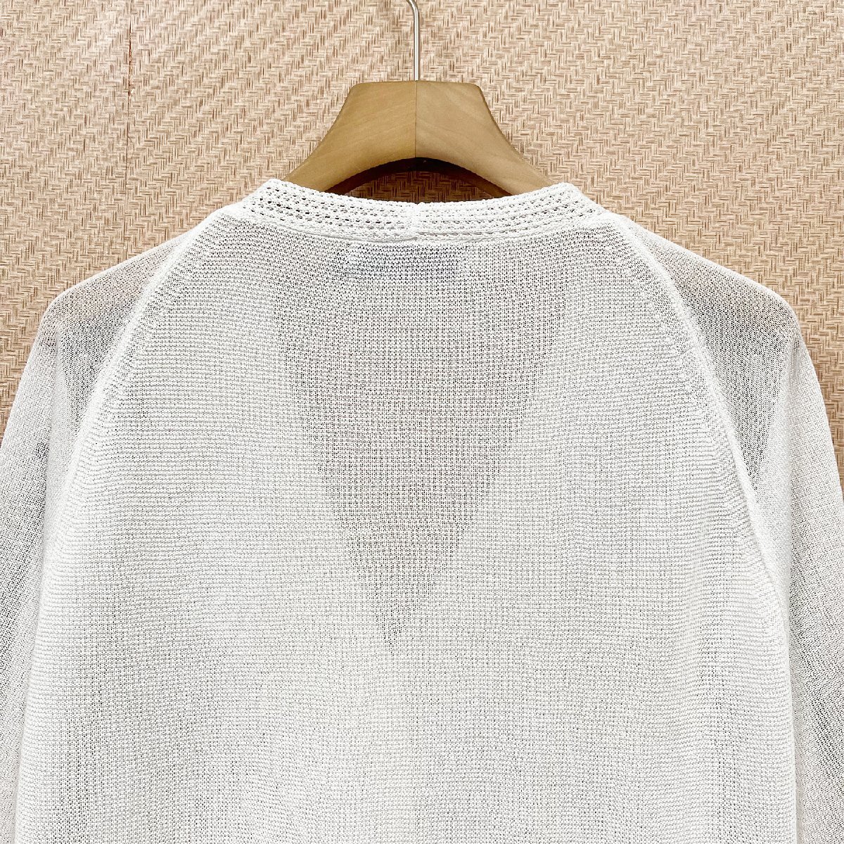 胸元は適度な開きのVネックで顔周りを女性らしくスッキリ見せてくれます。長袖なので気になる日焼けも防止してくれます。薄手の少し透け感がある素材が肌をきれいに上品に魅せてくれます。袖口や裾にはリブがが施され、体型に合わせてフィット感になっています。