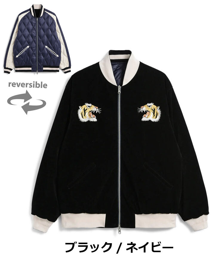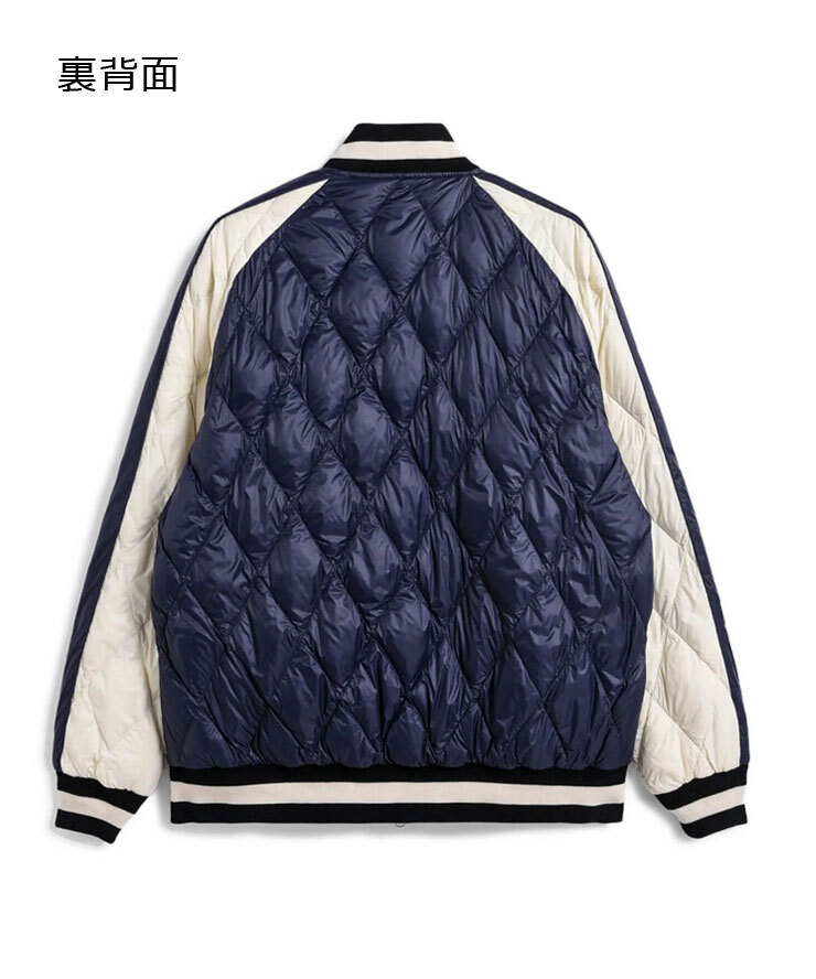 スカジャンとダウンを組み合わせた、スカジャン風リバーシブルダウンジャケット。