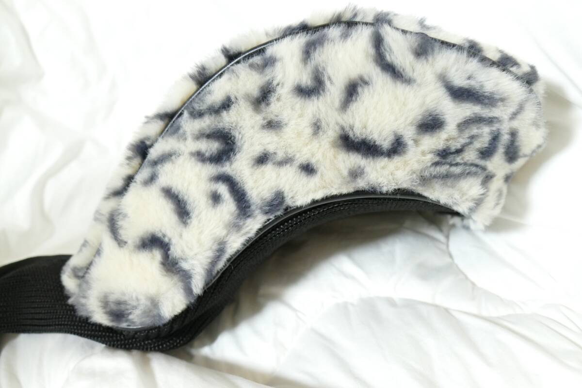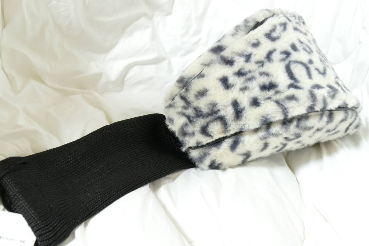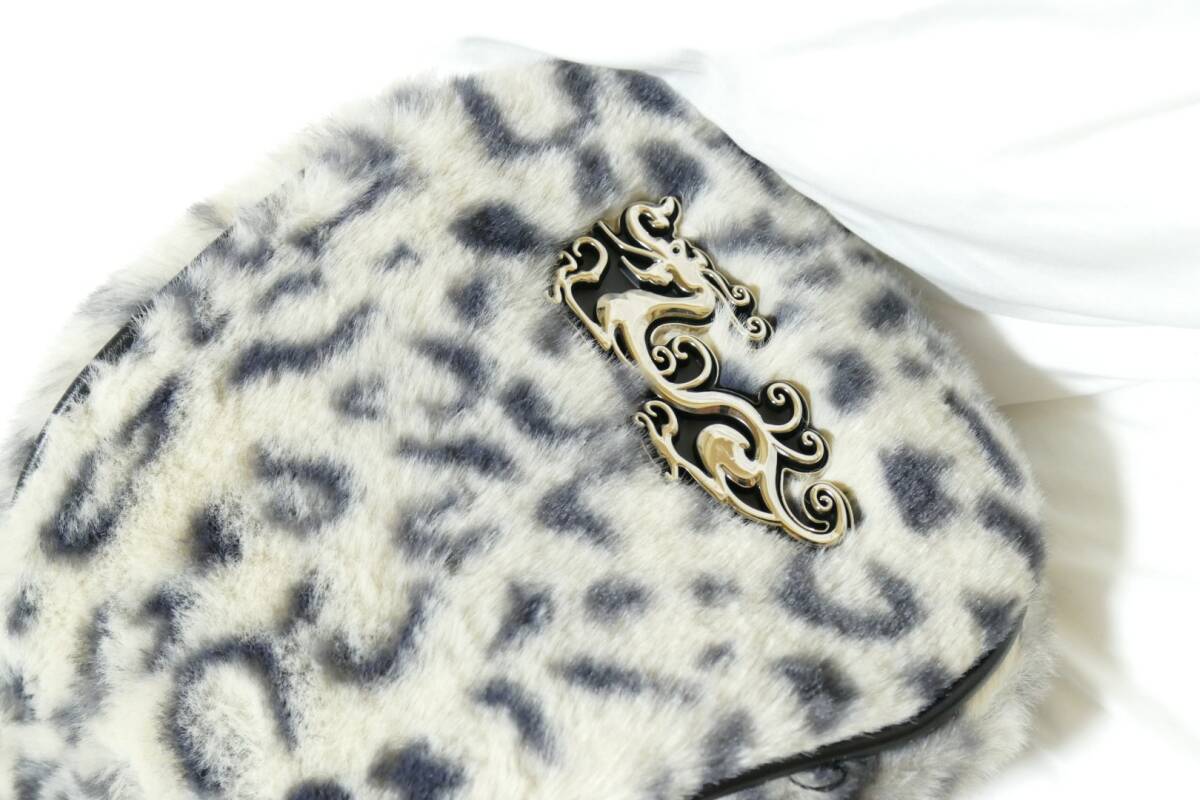 ★表地はふわふわのフェイクファー素材(レオパードプリント)で、ブランドの象徴であるドラゴンのロゴは、立体的で光沢のある金属製プレートになっています。