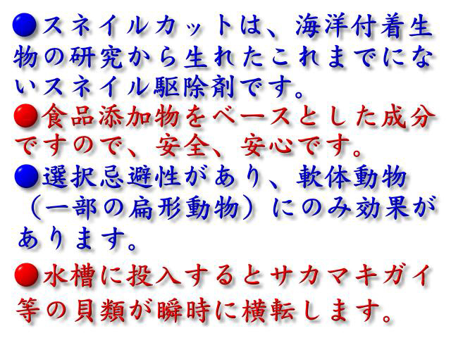 ●スネイルカットは、海洋付着生物の研究から生れたこれまでにないスネイル駆除剤です。