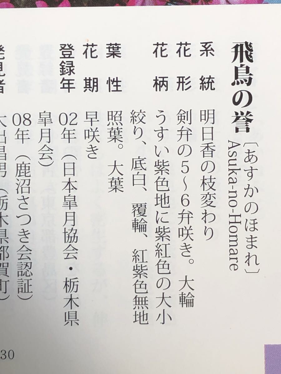 飛鳥の誉 特大の模様樹です。明日香の枝変わり薄い紫色地に紫紅色の絞りや底白、覆輪、紫紅色無地さらに白色無地等素晴らしい花芸の大輪花です。