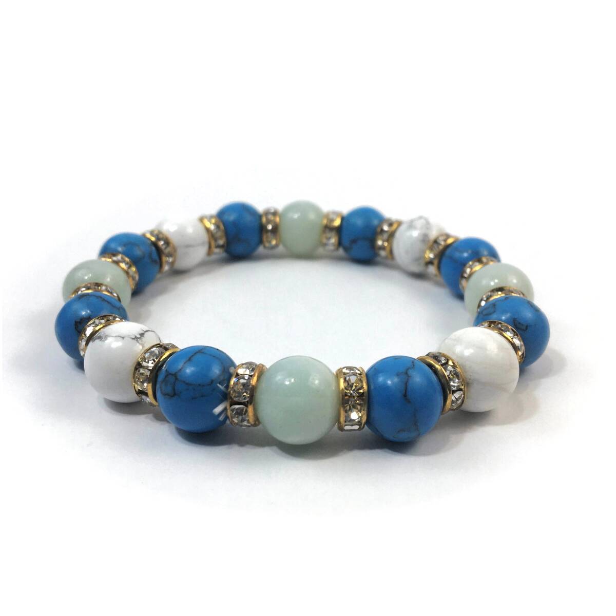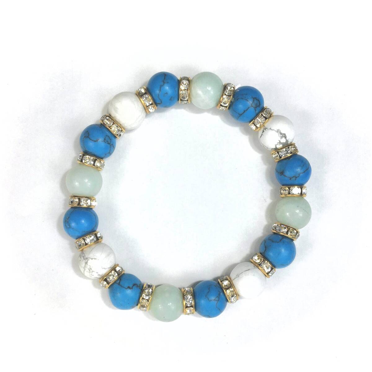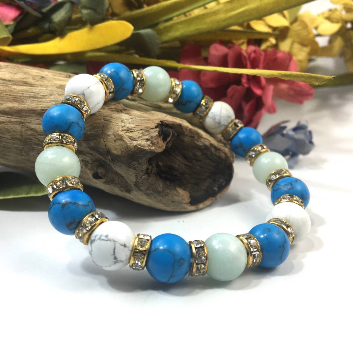 こちらは、アマゾナイトとハウライトとターコイズを組み合わせたブレスレットです。間にはロンデルを挟み高級感あるデザインに仕上がっています。石大きさは腕にも馴染みやすいように10mm玉で内径約17cm(伸可能)です。数に限りがございますので気になる方はお早めにどうぞ。サイズ調節も可能ですのでサイズ調節の場合は取引ナビにてご一報くださいませ。(サイズ調節無料です)