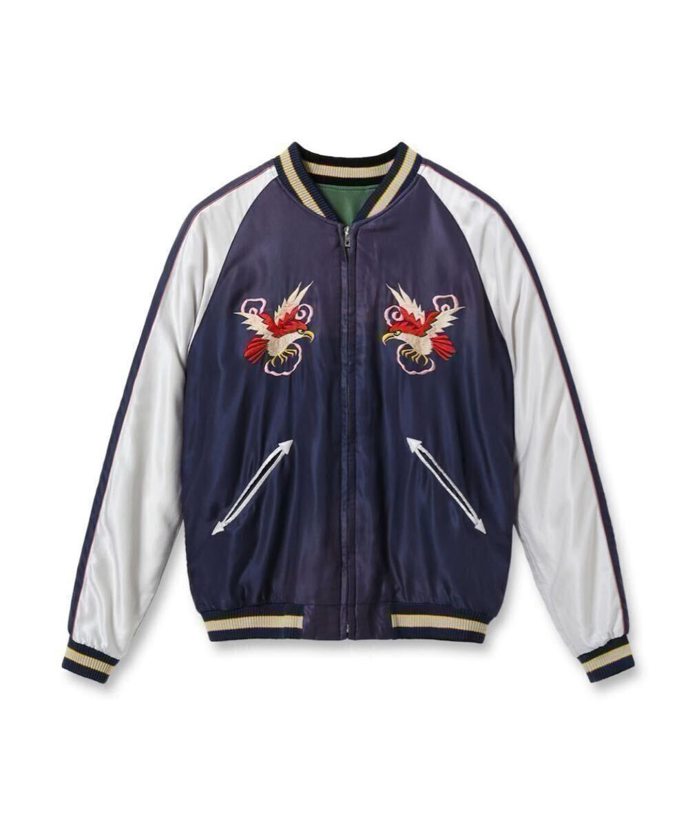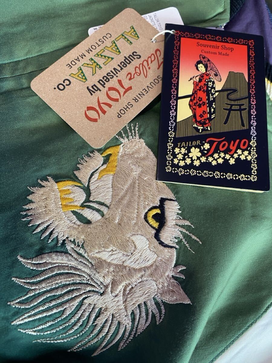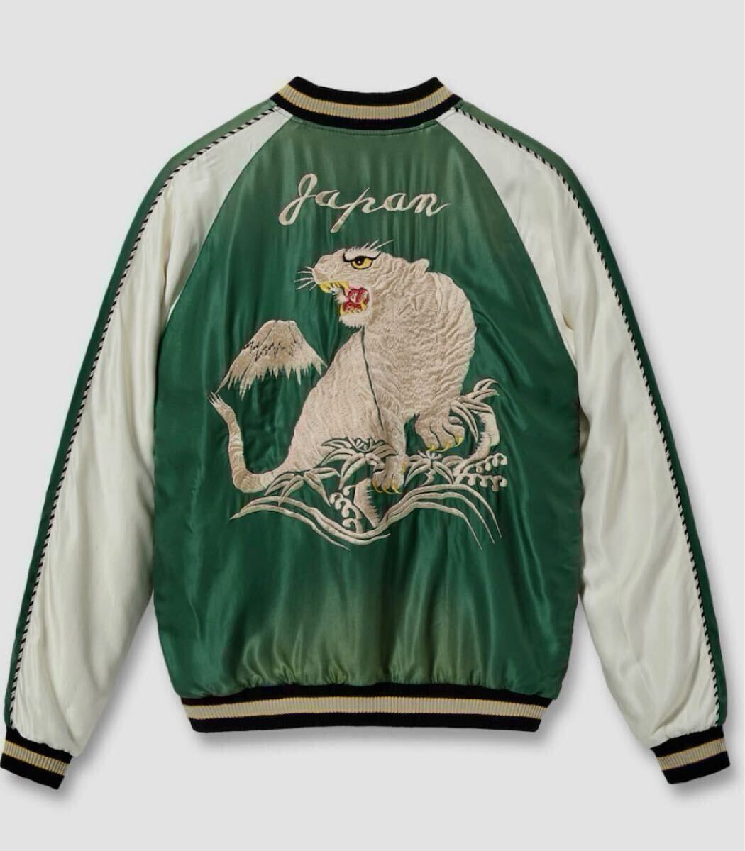 褪色したグリーンのボディに猛々しく吼える白虎が描かれた1950年代中期の作品。虎の身体には白い色糸のみを使い、特徴である縞模様や躍動感に満ちた姿を刺繍の針足で描き出した。スカジャンでは王道であり定番の虎柄だが、刺繍の完成度の高さから当時でもトップクラスの職人が手掛けた傑作であることがわかる。