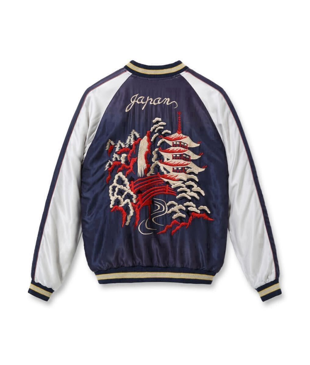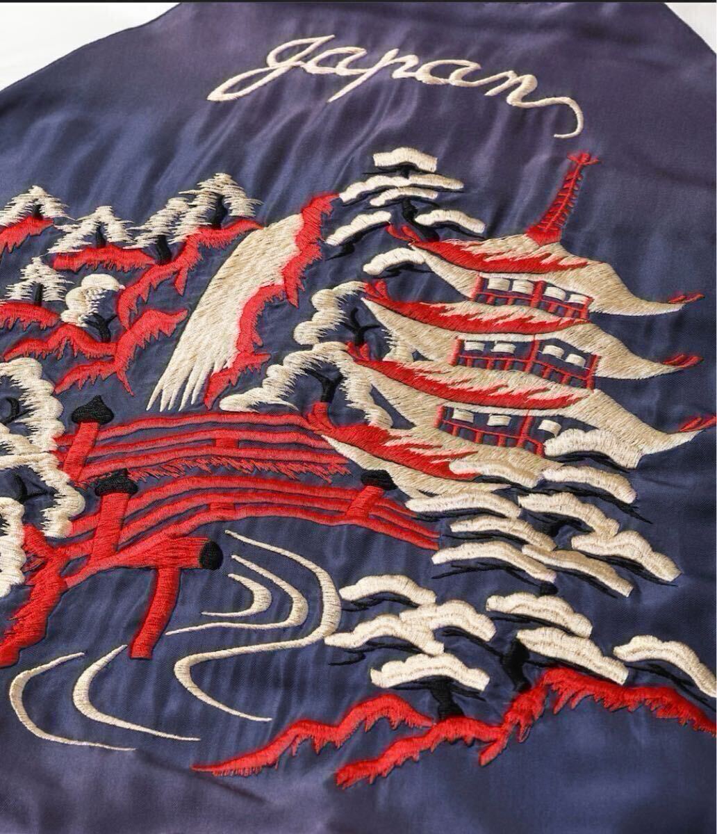 リバーシブル面も白い色糸を効果的に使い、雪が降り積もった冬の景色を想わせるランドスケープ柄。五重塔や太鼓橋、松や滝など山間の景色を極力色数をおさえて描き出すことで、エイジング加工されたネイビーのボディに刺繍の白や赤が映えるよう計算された構成となっている。