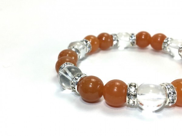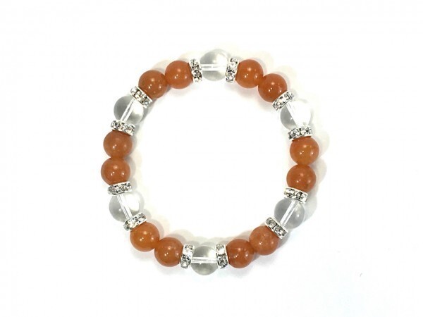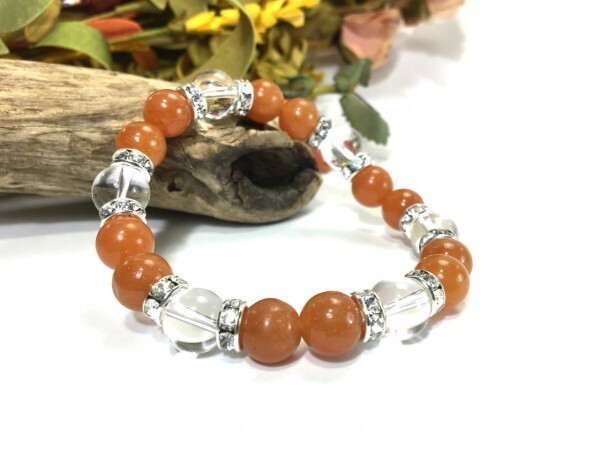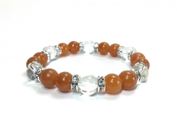 こちらは、レッドアベンチュリンと水晶を組み合わせたブレスレットです。間にはロンデルを挟み高級感あるデザインに仕上がっています。石大きさは腕にも馴染みやすいように10mm玉で内径約18cm(伸可能)です。数に限りがございますので気になる方はお早めにどうぞ。サイズ調節も可能ですのでサイズ調節の場合は取引ナビにてご一報くださいませ。(サイズ調節無料です)