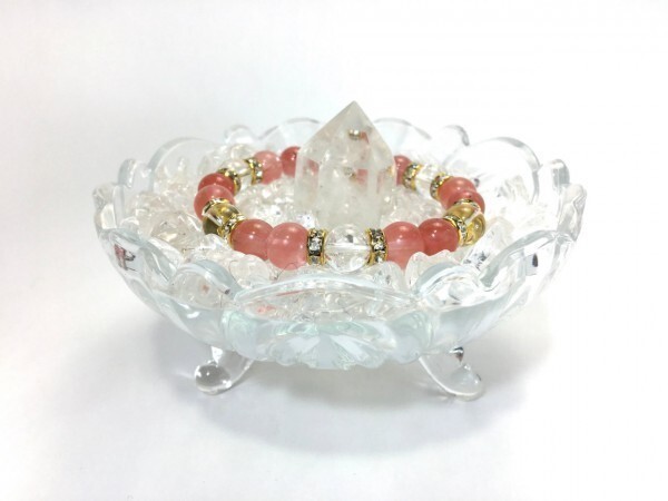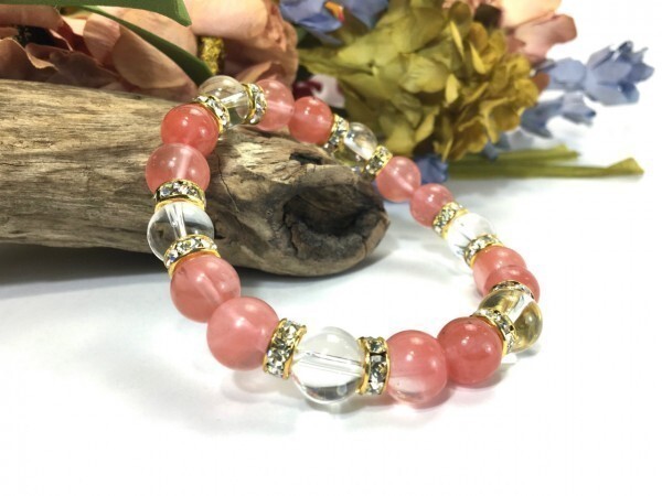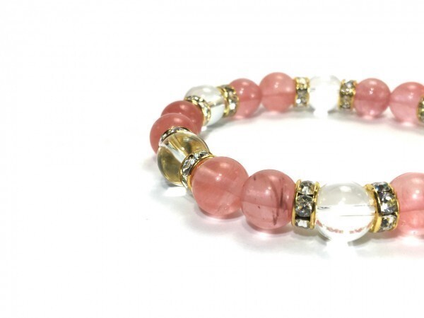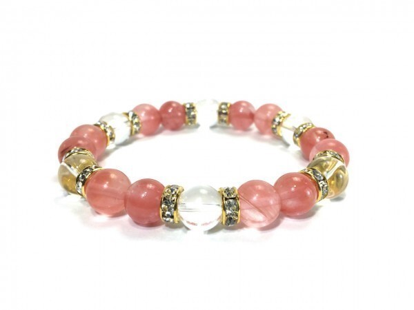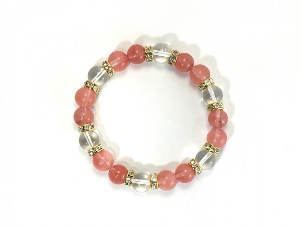 こちらは、チェリークォーツと水晶を組み合わせたブレスレットです。間にはロンデルを挟み高級感あるデザインに仕上がっています。石大きさは腕にも馴染みやすいように10mm玉で内径約18cm(伸可能)です。数に限りがございますので気になる方はお早めにどうぞ。サイズ調節も可能ですのでサイズ調節の場合は取引ナビにてご一報くださいませ。(サイズ調節無料です)