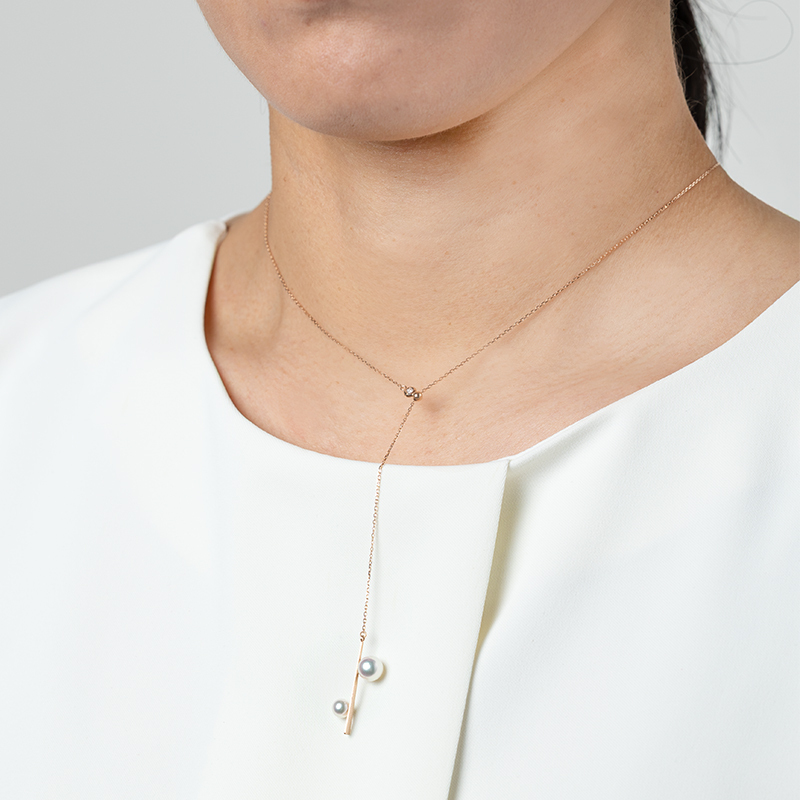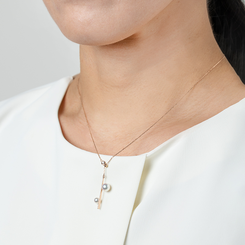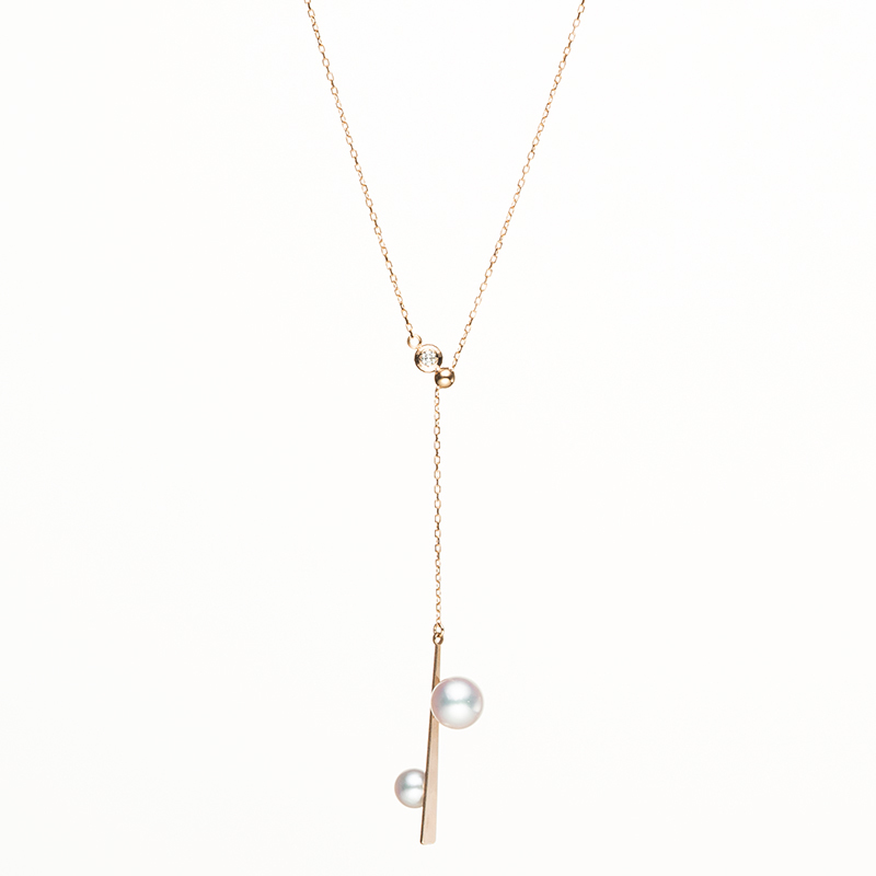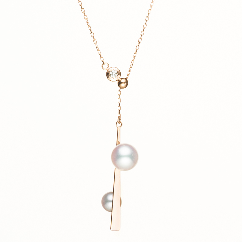 K18ピンクゴールドのプレートバーに、4.7mmと6.2mmのアコヤパールを互い違いにセッティングした、モダンで洗練されたネックレス。