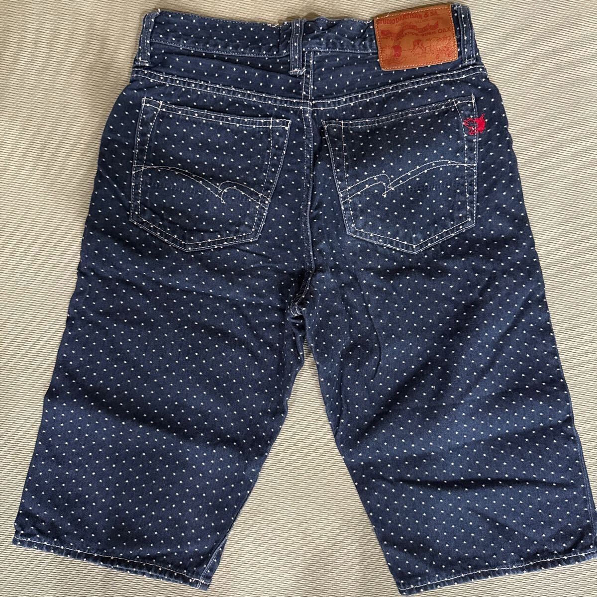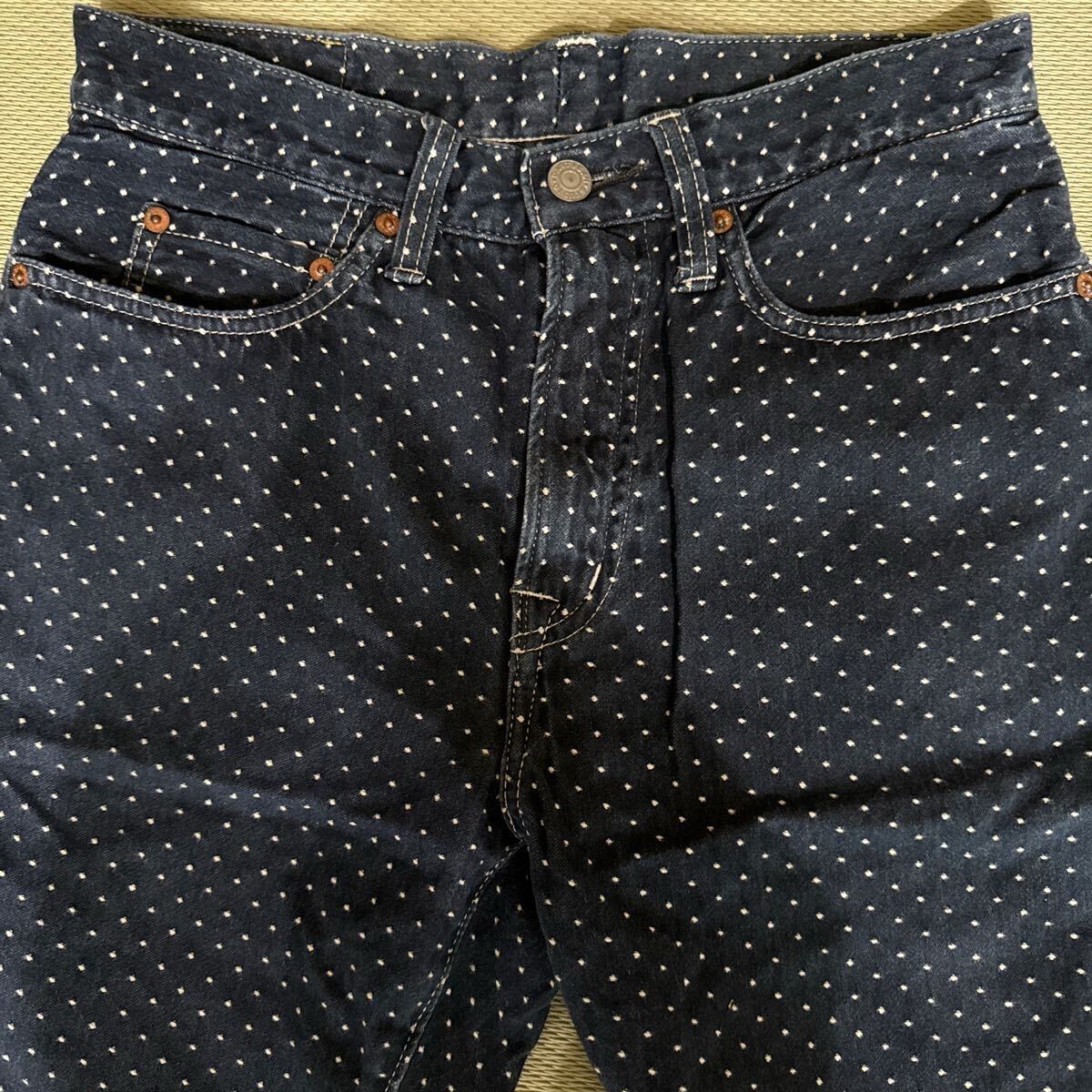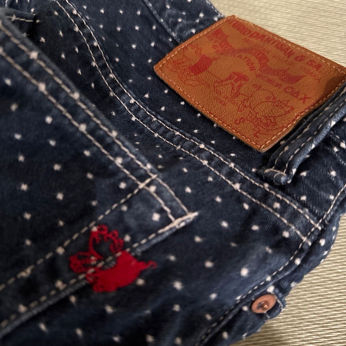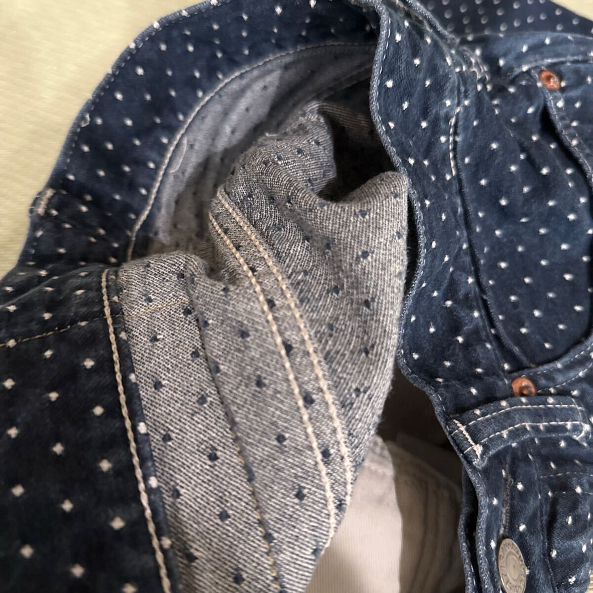 ドット柄、水玉柄の織のデニム地で赤色のダルチの刺繍マークが目立って珍しいと思います。パッチは皮です。