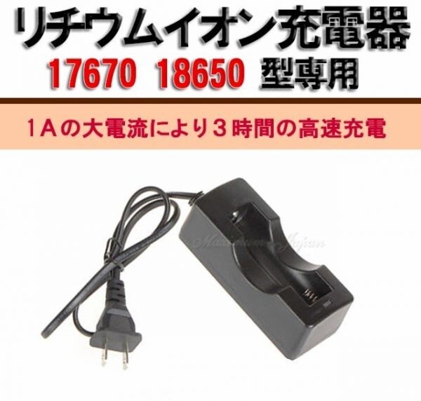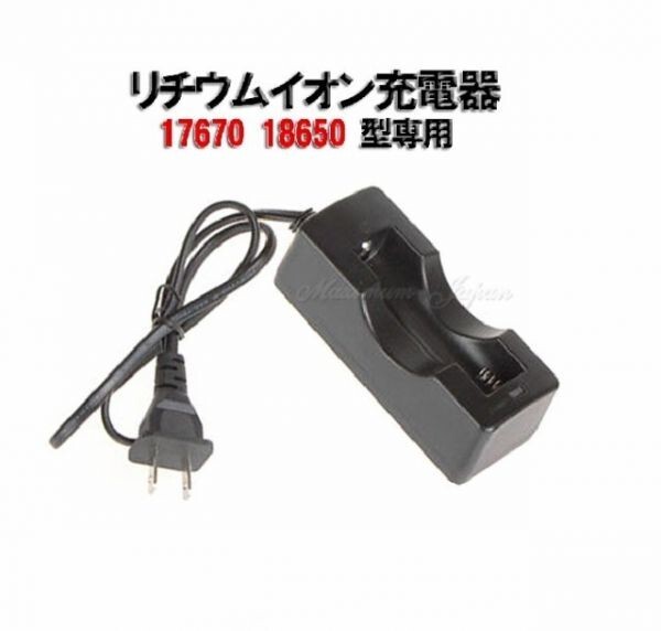 | 特長 | 3.6V-3.7Vの17670、18650タイプのリチウムイオン充電池が1本充電できます。 1Aの大電流により3時間の高速充電。 入力:AC100-240V 50Hz/60Hz 500mA max 出力:DC4.2V/800ma 電源ケーブル長:約110cm |