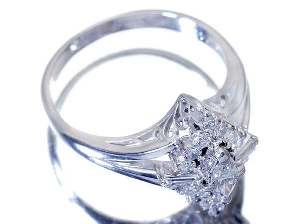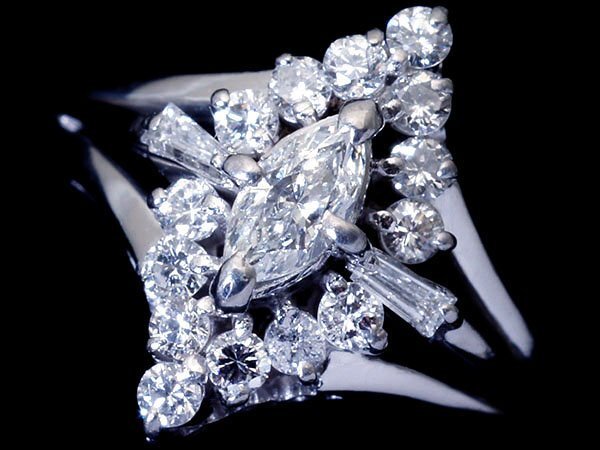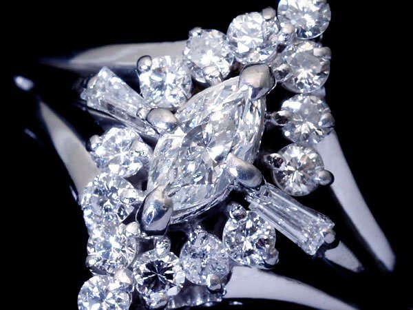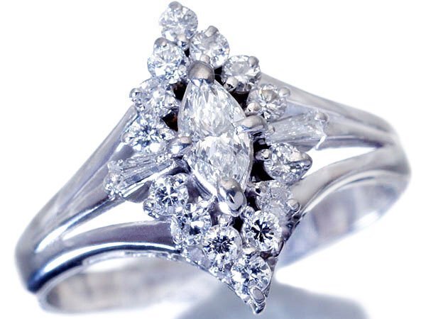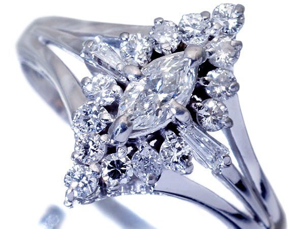 繊細な輝き放つマーキスカット良質天然ダイヤモンド総計0.42ctを素敵に宝飾した、高級Pt850リングを1円から特別大放出致します!