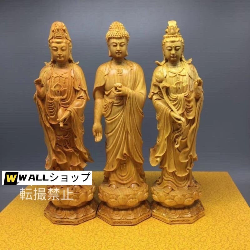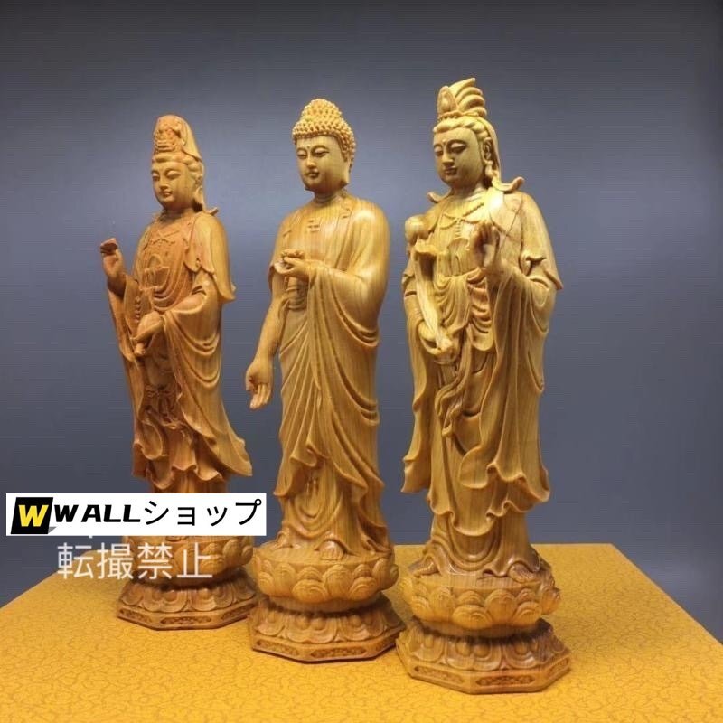 ツゲ 観音菩薩 木彫仏像 阿弥陀如来三尊立像 仏教美術高さ約20cm