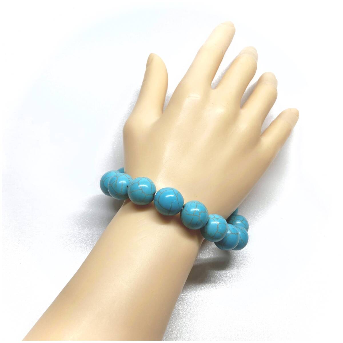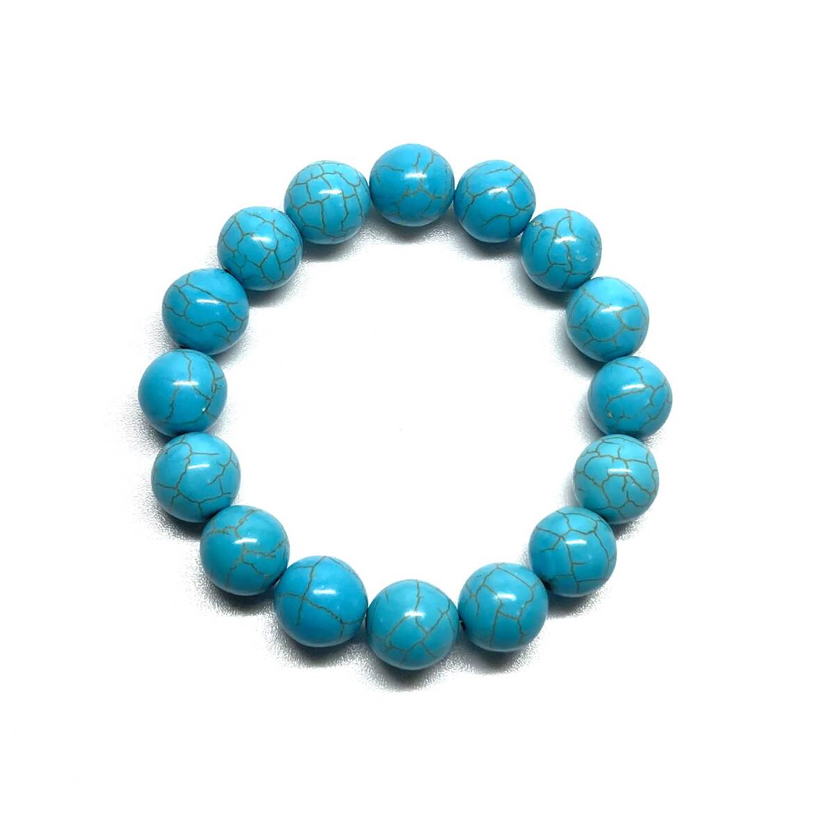 こちらは、ターコイズの14mm玉を使用したパワーストーンブレスレットです。シンプルなデザインですのでどんなコーディネートとも合わせ易いブレスレットです。インパクトがある14mm玉を使用して内周約17cmです。パワーストーンを付けてる方へのプレゼントにもお勧めです。14mmサイズのリクエストが多々ありましたので少量ですが販売しました。気になる方はお早めにどうぞ。