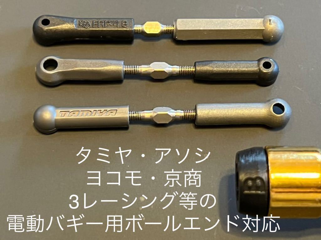 タミヤバギー用5mm強化アジャスター(TAMIYA刻印入り)の他、ヨコモ、アソシエイテッド、京商、3レーシング等のバギー用ボールエンドを回す事が出来ます。タミヤのツーリング用等小さめのツーリングカー用等は空回りしますので、ツーリング用タイプTをお使い下さい。