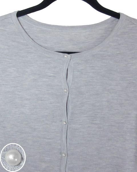 コメント | 肌触りの良いやや薄手のカーディガン。 シンプルデザインで使いやすいアイテム。 ボタンやお袖先の折り返し部分にはパールがついていて 華やかな雰囲気。 |