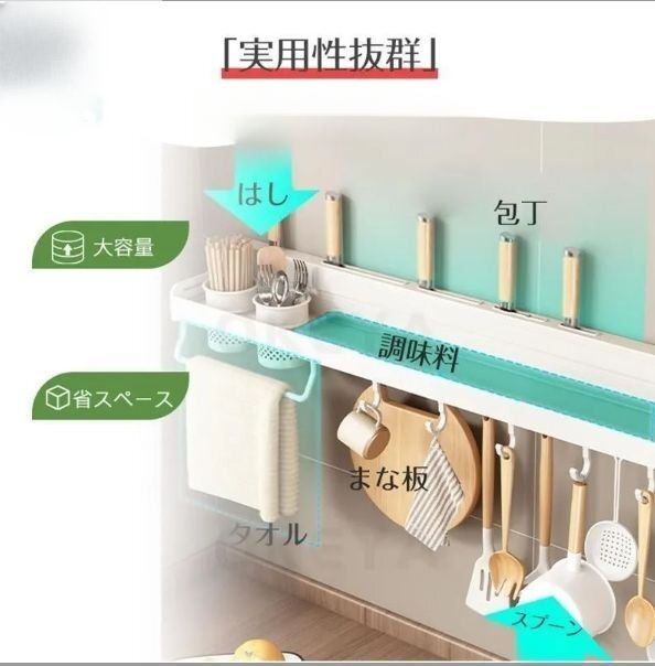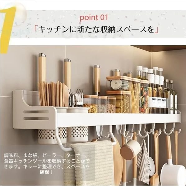 【 7イン1 】携帯スタンド、移動式フック、調味料入れ、タオル掛け、まな板立て、包丁収納、箸入れを一気に揃います。調味料、まな板、ピーラー、ターナー、食器キッチンツールを収納することができます。キレーに整理でき、スペースを確保 【粘着力抜群】耐荷重は20kgで、吸盤と違って時間が経ってはがれ落ちることもなくて、しっかり壁に固定されてずれたり取れたりすることもありません。 【ネジなし】キッチンやバスルームの壁面に粘着シートを貼り付ける事で好きな場所にラックを設置できます。ネジ留め不要なのでネジ穴やテープ痕が残りません。 【多機能】箸、ナイフ、フォークを入れて簡単に乾燥できる箸スプーンホルダーとナイフホルダーで設計されています。さらに、移動式フックをデザインしており、料理を作る時に、調味料や、タオル、スプーンを簡単に取れまして、慌ててする必要がありません