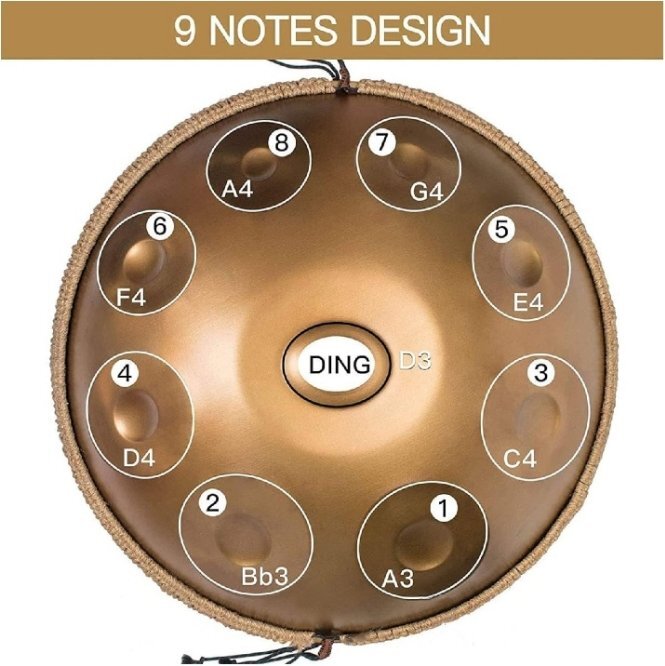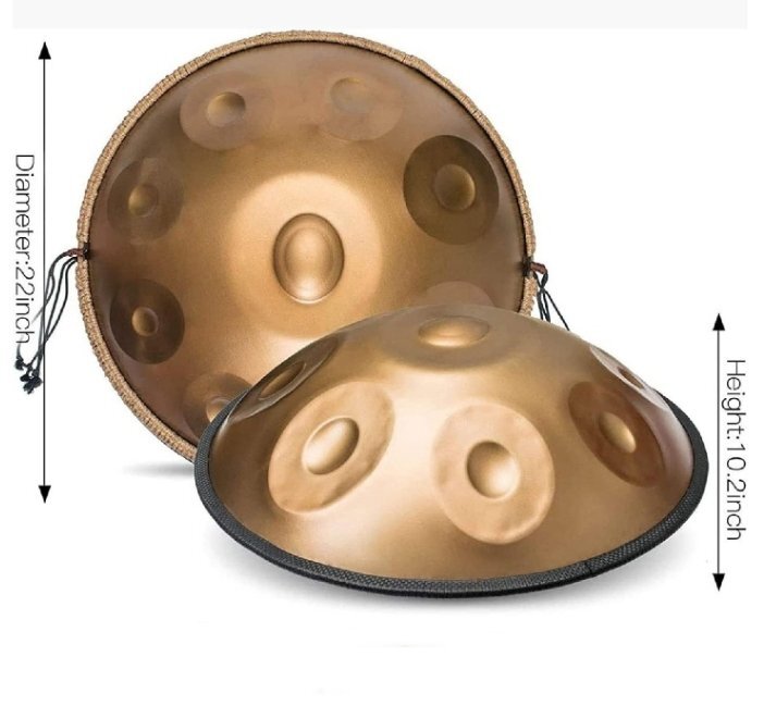 ●ゴールドハンドパンスチールドラム22インチdマイナー、9つのセンターノートと8トーン(d3 a bb c d e f g aを含む9枚のメモ)
