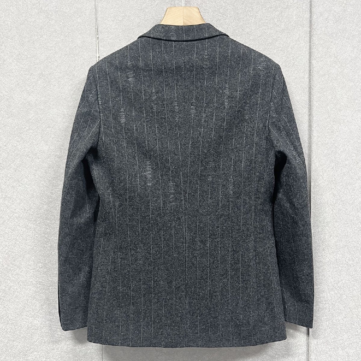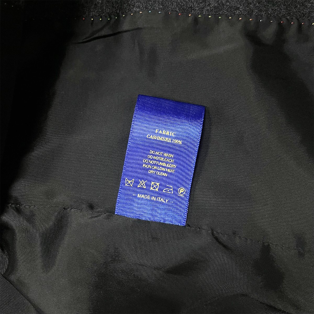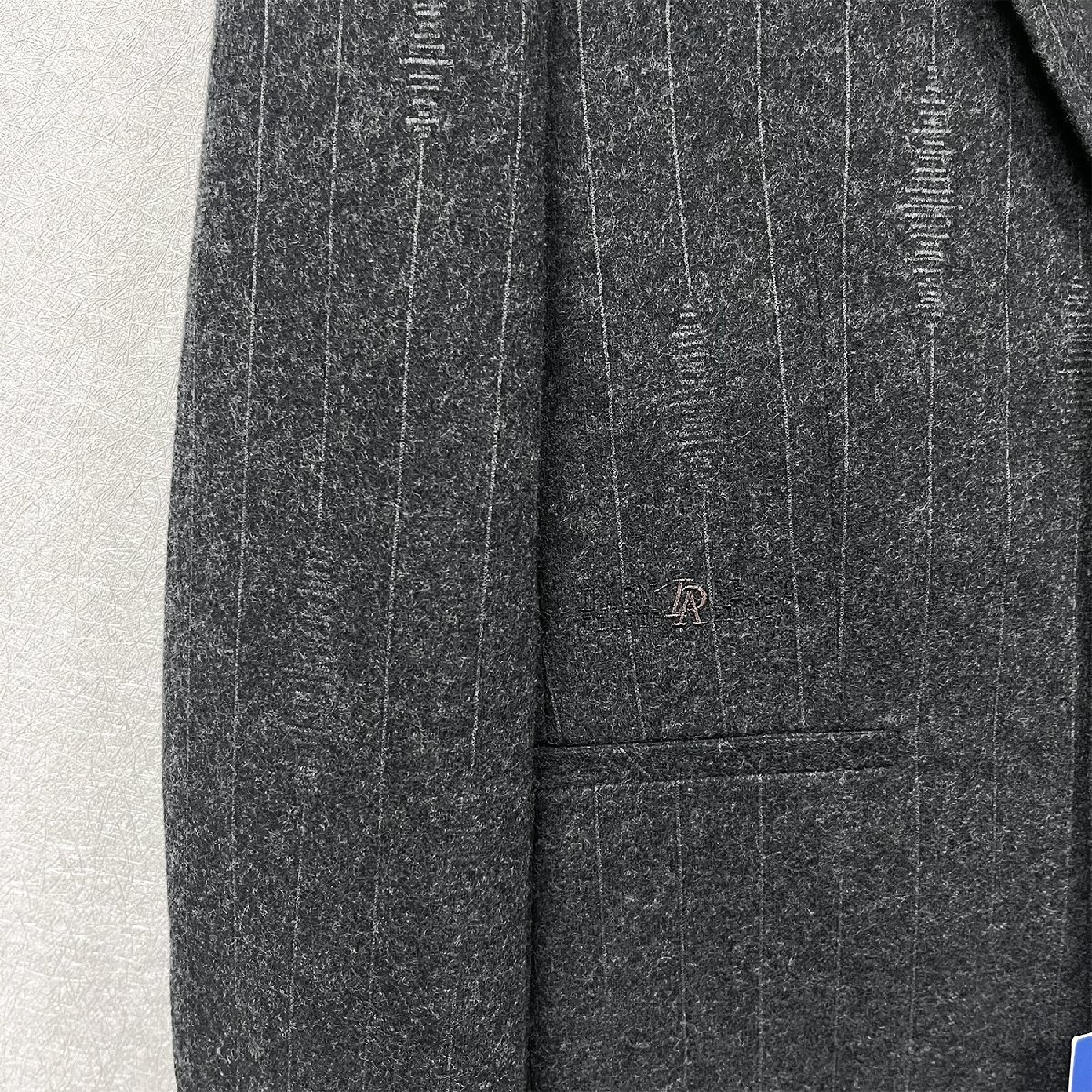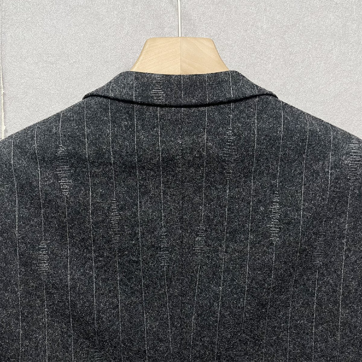 上品なストライプ柄をあしらい、シンプルながらも存在感があります。襟元には取り外し可能なブローチが付いており、気分やシーンに合わせてアレンジが可能です。右側には控えめな英文刺繍が施されていて、さりげないアクセントになっています。両サイドには便利なポケットがあり、内ポケットと胸ポケットも備えているため、スマートフォンや小物の収納にとても便利です。
