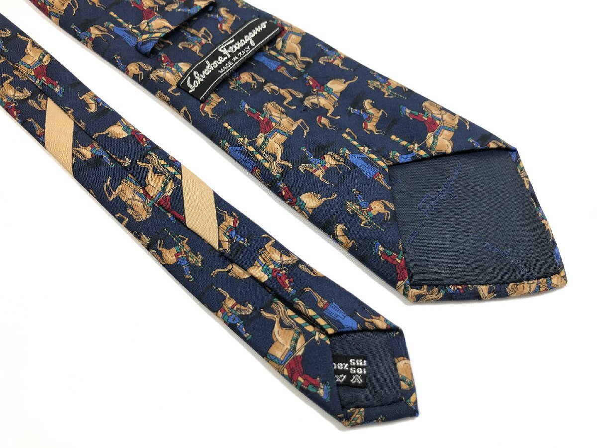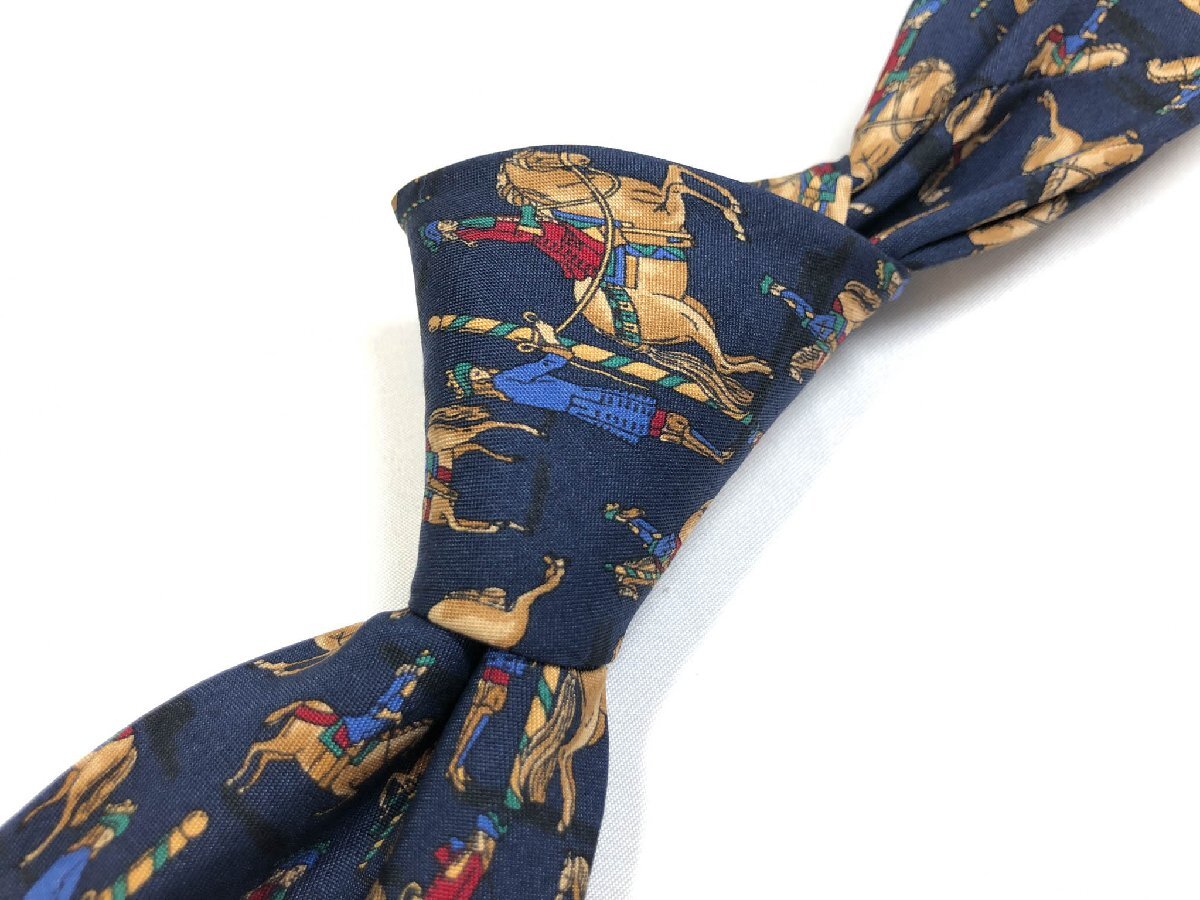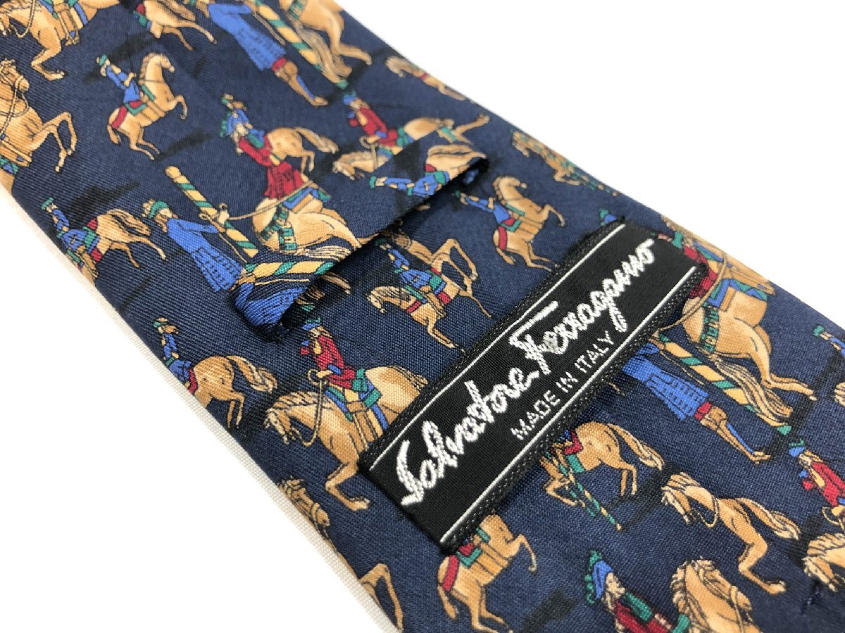 美品【Salvatore Ferragamo サルヴァトーレフェラガモ 】乗馬プリント柄♪ シルク ネクタイ (メンズ) 濃いめのネイビー系 伊製◇17MM8712◇