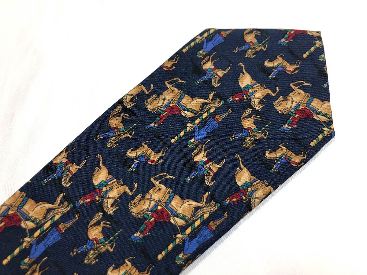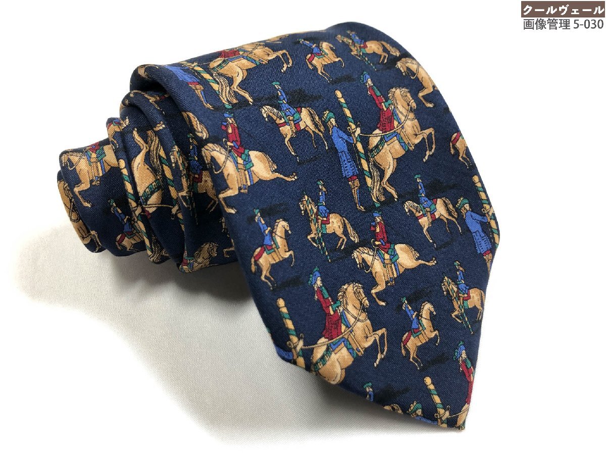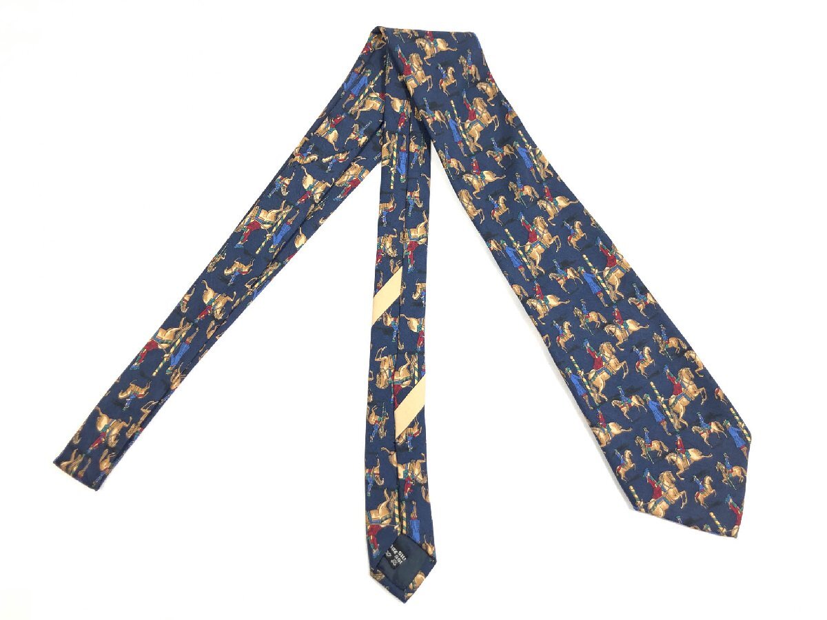 美品【Salvatore Ferragamo サルヴァトーレフェラガモ 】乗馬プリント柄♪ シルク ネクタイ (メンズ) 濃いめのネイビー系 伊製◇17MM8712◇