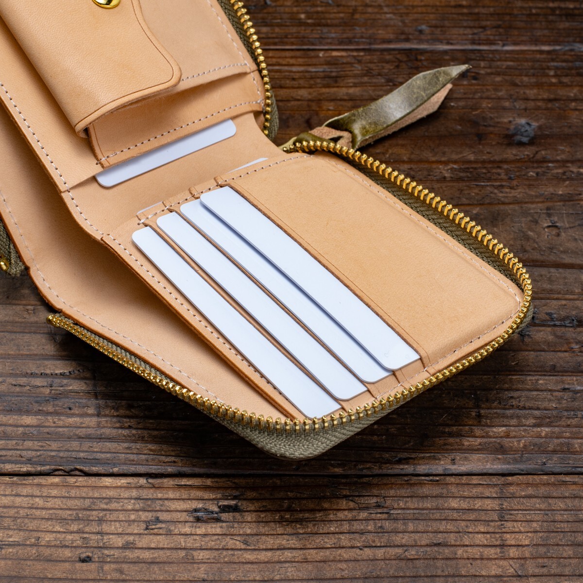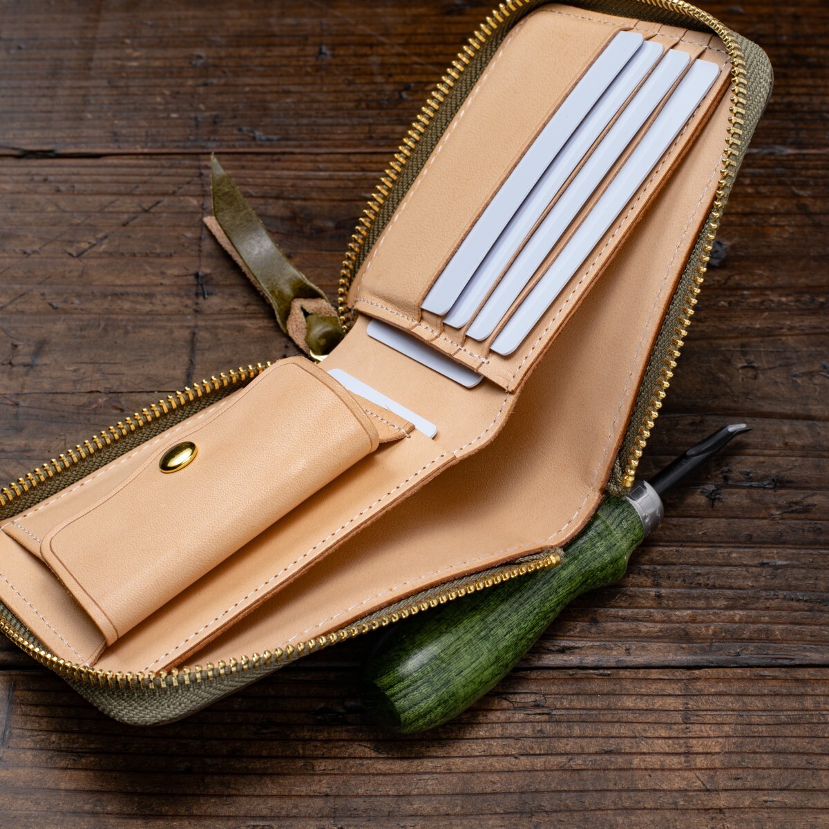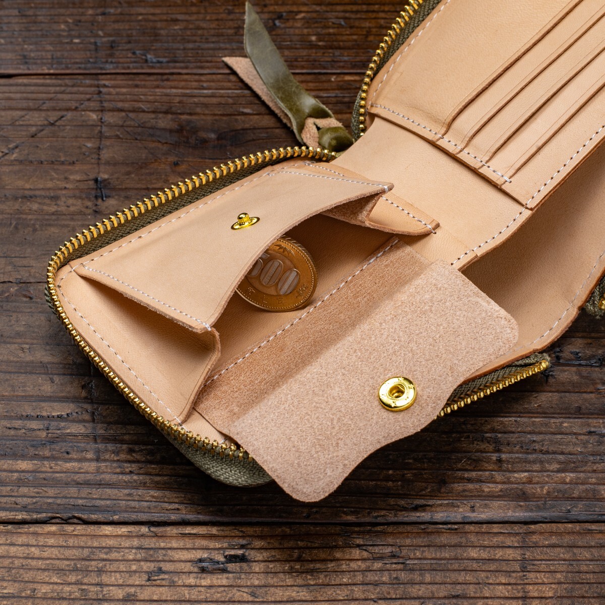 収納は直感的で使いやすく、一万円札を折らずに収められる札入れ、小銭が取り出しやすいマチ付きの小銭入れを備えています。ファスナーはYKK製の5番サイズを採用しており、長く使っても動きが変わらず安心です。