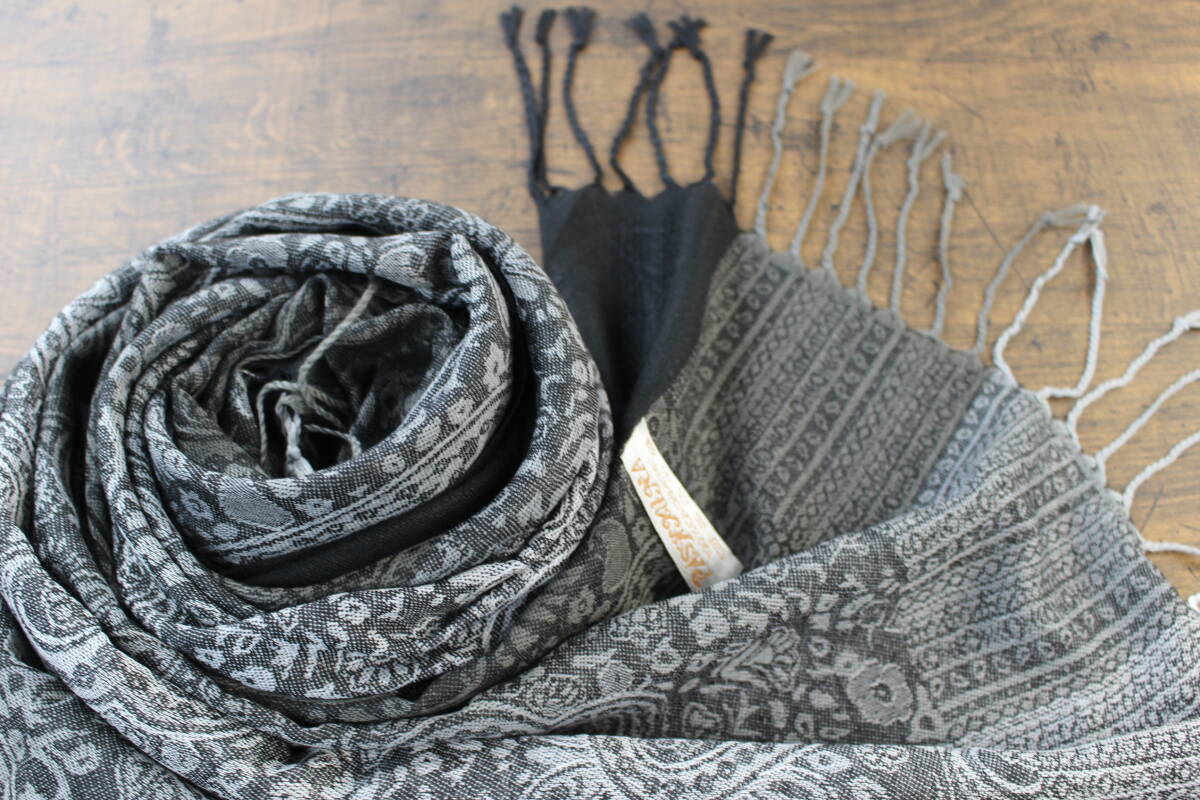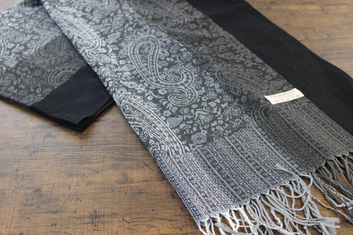 新品【パシュミナ Pashmina】ペイズリー柄 ブラック系グラデーション 黒 BLACK 大判 ストール カシミア100% Cashmere