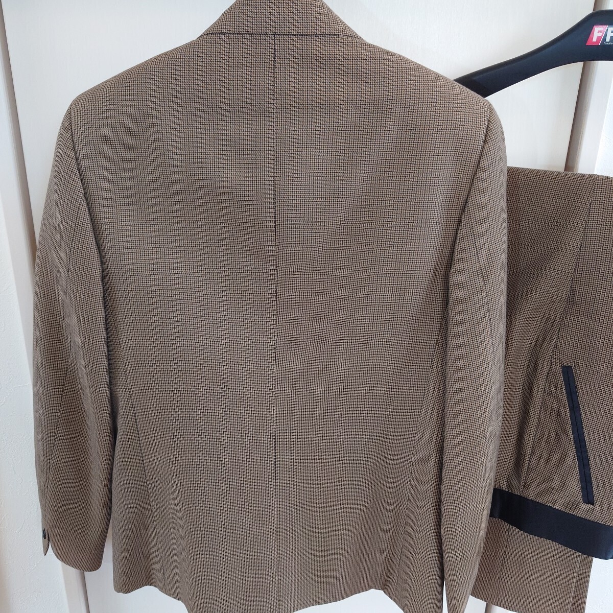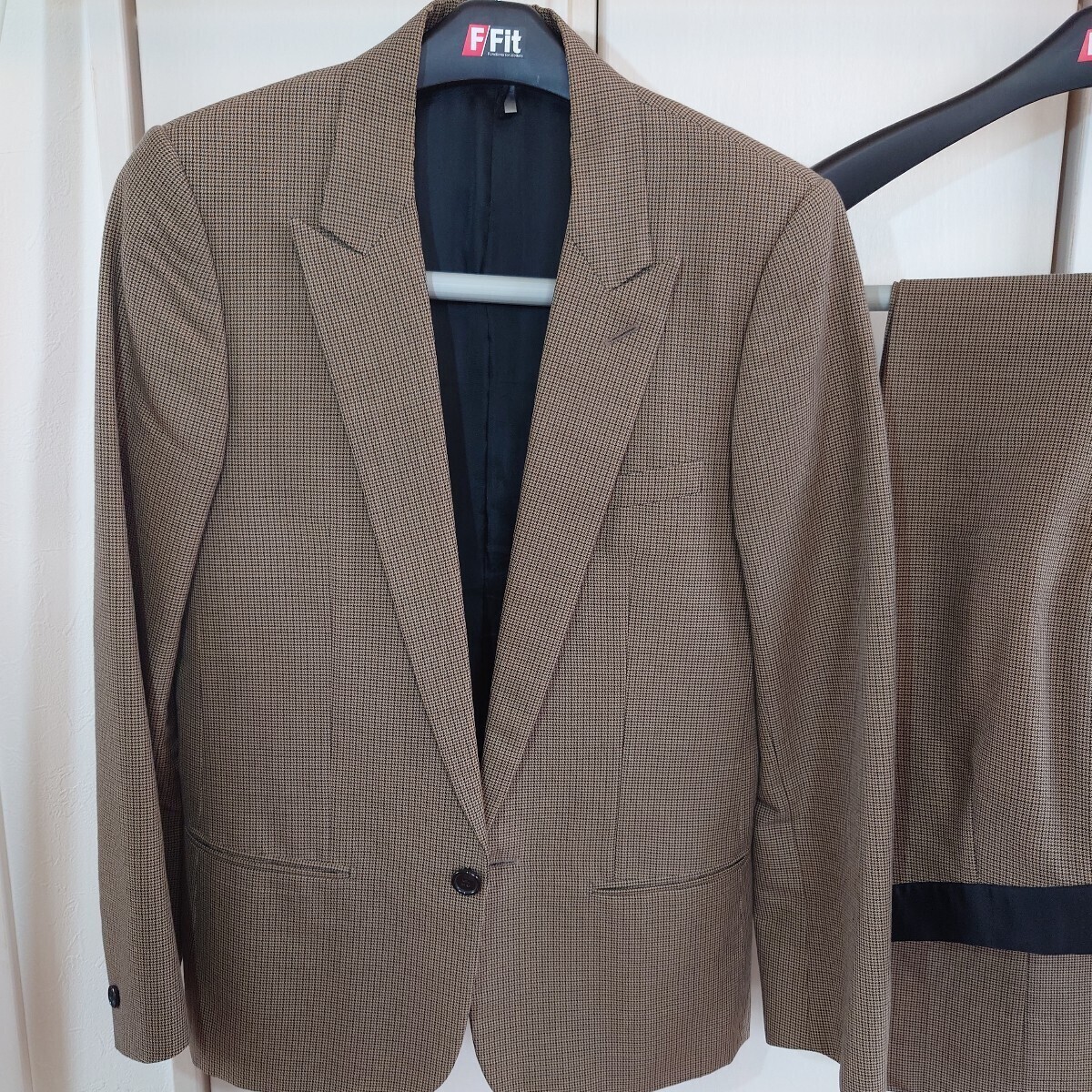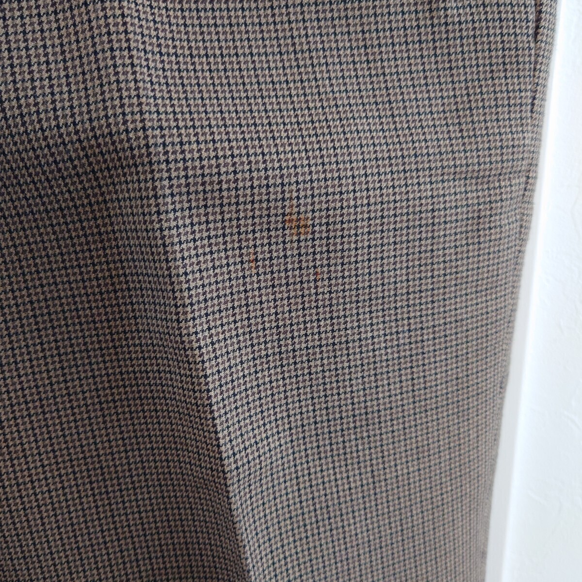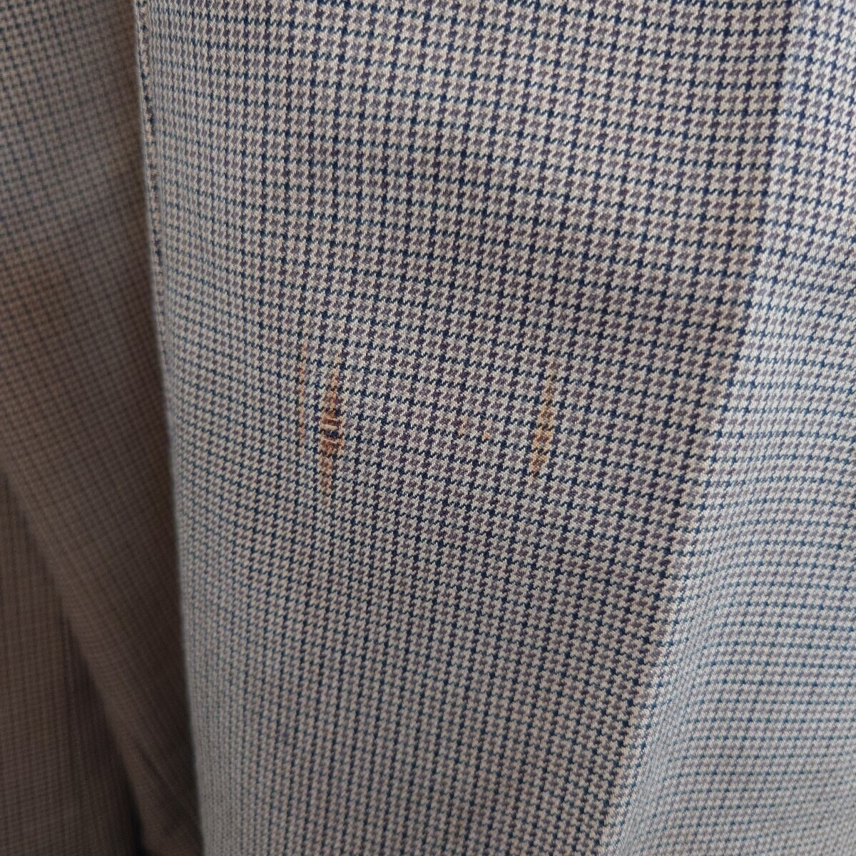残念ながらパンツの前面にシミ、ジャケットの右袖先にも薄いシミがあります