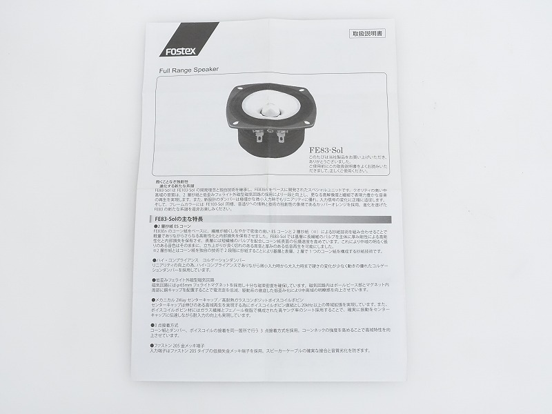 ■メーカー : FOSTEX ■型番 : FE83-Sol ■インピーダンス : 8Ω ※ペアでの出品となります。 【商品の状態 当店での確認内容】 本商品は動作確認は行っておらず、詳細な状態については保証いたしかねます。 ※上記により【現状商品】としての出品となります。 「商品の状態」に関しましては当方主観の目安となります。外観などは中古品で個人差もありますので詳細は画像にてご判断ください。 画像にて不明な点はご質問下さい。 出品商品は画像のものですべてになります。画像に写っているもの以外は付属いたしません。 ※注意※ ヤフオクのシステム上、送料表記が送料未定となっておりますが、送料に関しては全て有償となりますので下記を参照下さい。 【送料 全国一律 950 円 沖縄、離島は別途お見積り】 ※送料がお得になるサービスです(下取りシステムのご案内です) 当ストアでは商品を安全にお届け出来るよう提携運送会社と協議の上、発泡緩衝材や強度段ボールの使用等 運送会社が指定する梱包方法や資材を採用しております。 より安全にお届け出来るよう商品仕様により梱包サイズが大きくなる場合や個口数が増える事がございます。 【当ストアオークションルールを入札前に必ずご確認ください。】 【落札後の取引手順】 ・落札後は取引ナビにて、必要事項をご入力後、送信ください。 取引終了後48時間(土、日は除く)以内に入力をお願い致します。 ※ご連絡が頂けない場合は落札者様都合でのキャンセルとさせていただきます。 ・落札代金(商品代金+消費税+送料)の入金をお願い致します。 ※大型商品の場合は送料確定後の決済となる為取引ナビを入力頂き、当ストアより送料のご案内が来るまでお待ちください。(土曜、日曜、祝日の場合は翌営業日より順次ご案内いたします) ・お支払い方法は※クレジットカード/※PayPay残高/※PayPayクレジット/PayPay銀行/ゆうちょ銀行のみです。 ※商品代金引換(代引き)のお取り扱いはしておりません。 ※領収証の発行が必要な方はご連絡ください。 ※銀行振込の際の振込手数料はご負担願います。 ・入金確認後に出荷手配を致します。 (原則入金確認後3営業日以内に発送いたしますが、大型や重量のある製品はお時間をいただく場合もございます。) ・発送は当店指定の運送会社の元払いのみでの発送となります。 ※他の運送会社、送料代引き等は致しかねます。 ※落札者様ご自身での運送会社の手配いただく事も可能ですが荷物事故の責任の所在の問題上、梱包は致しかねます。 ※店頭にお越し頂き手渡しも可能(福岡市早良区)です。ご希望の方はご落札後にご連絡下さい。 ・大型/重量物商品の送料につきましては商品の特性上、荷降ろし状況等により送料が大きく前後し運送業者に別途見積りが必要な為、早めのお問い合わせにてお見積り上、入札をお願い致します。 【初期不良の保証について】 ・商品到着後の初期動作不良、また配送中の事故による破損、不具合が有る場合は、商品発送後10日以内に当ストアまでご連絡ください。当ストアでは修理での対応を優先させて頂きますが、修理不可の場合は全額返金させて頂きます。 (商品代金+消費税+送料のお支払い頂いた金額となります) 【初期不良の保証の対象外について】 次の場合は保証の対象外となりますのご留意ください ・ジャンク商品、現状商品、難あり商品での出品商品。 ※難あり商品に関しましては動作確認時に一部動作不良が確認された商品になり、記載している動作確認以外にも、動作不良がある可能性もございます。こちらに関しましても保証対象外となりますことをご理解ください。 ・年代物のオーディオなどで、当店にてわからない範囲で部品が交換されている場合 ・楽器類の特殊機材(マイクロスコープ等)での確認までは行っておりません。気になる方は事前にご質問いただくか、入札をお控えください。 ※初期不良に関しましては【商品の状態】に記載のもの、またそれによって起因する動作不良は対象外です。 ※商品発送後10日を過ぎてのご連絡は対応が出来ませんので、商品が到着しましたらお早めに確認をお願い致します。 【メーカー保証の加入・継承】 ・未使用品、展示品やメーカー保証期間が残っている商品に関しまして、メーカー保証の加入、継承が必要な方は、落札後取引ナビ内にて当ストアにお知らせください。商品発送までにご連絡いただけない場合、メーカー保証の手続きを承れない場合があります。 【評価について】 ・評価不要の場合、必ず取引ナビの「要望欄」にてお知らせください。それ以外でご連絡をいただいた場合、対応できない可能性がございます。一度行った評価はシステム上取り消しが行えませんのでご了承ください。 【入札削除・キャンセルについて】 ・入札後はトラブル防止の為いかなる事情がおきましても入札を削除等は致しておりません。 ご検討の上入札をお願い致します。間違った際の入札額の金額訂正はご自身で行ってください