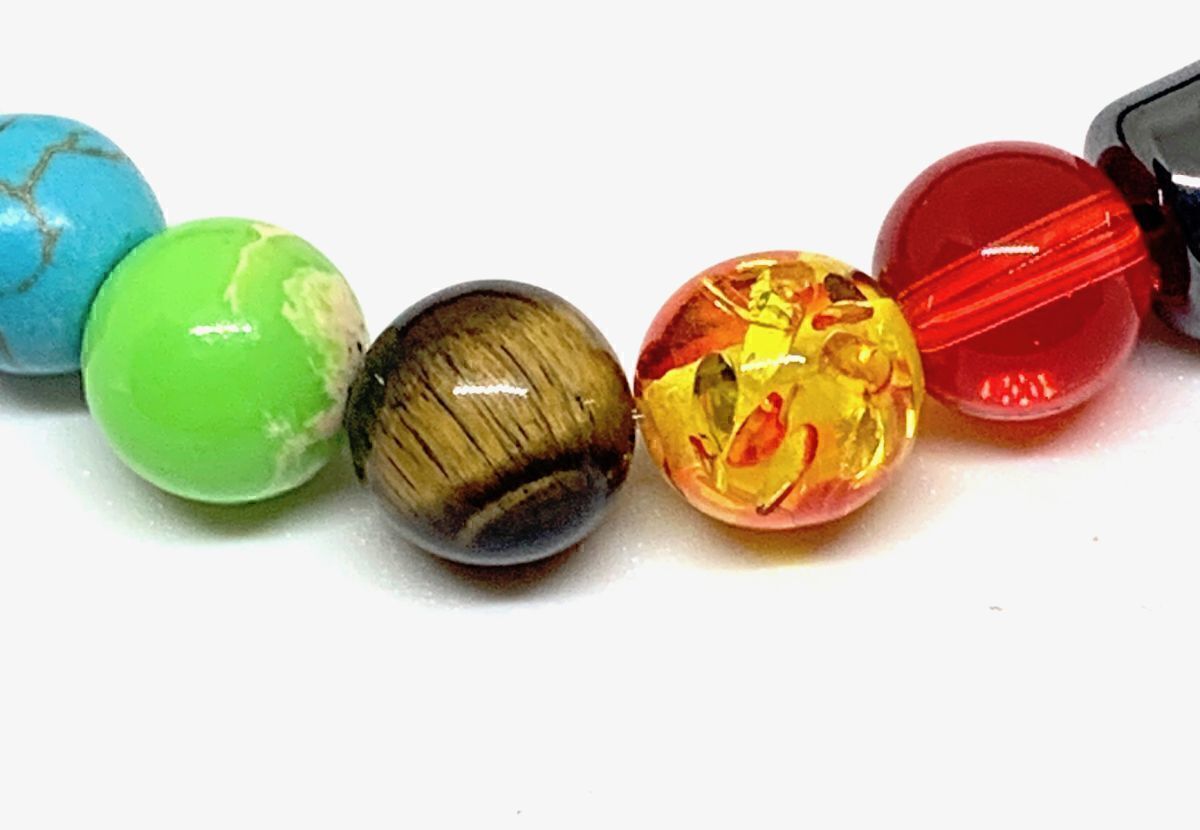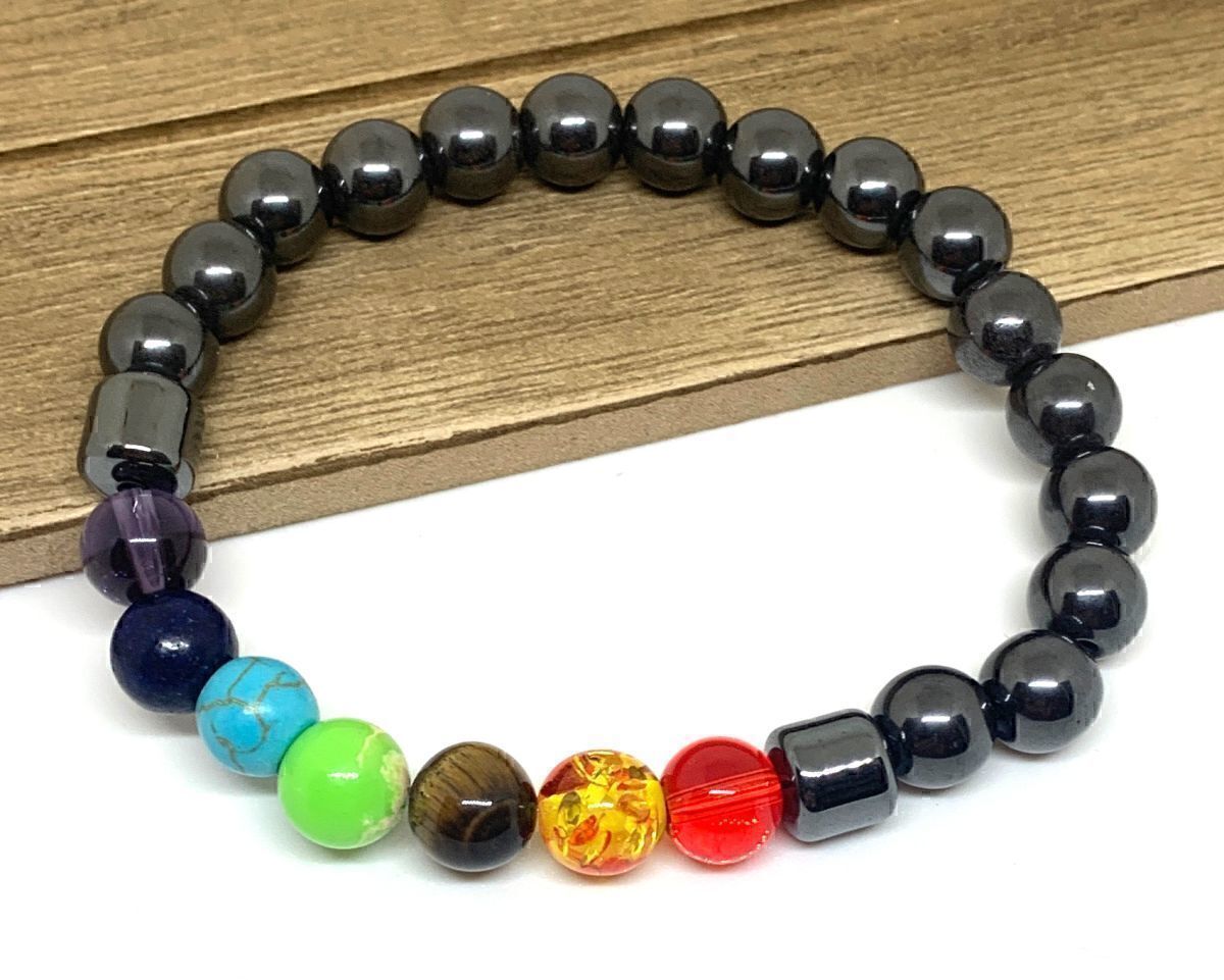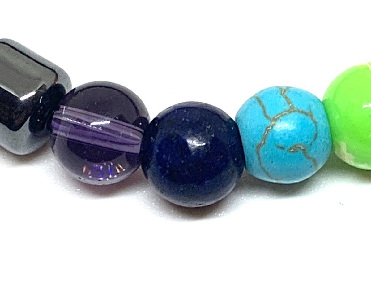 カラフルなヘマタイト磁気ブレスレットのご案内です。 タイガーアイやラピスラズリやターコイズなど7種のパワーストーンが虹を表現していて美しいです。磁気ヘマタイトは身に着ける人の血液にエネルギーを与えるとされています。 赤血球の働きを活性化し、全身への酸素供給量が高める事から、 運動能力を高める効果や肉体労働をされている方には特におすすめで持久力を高めると言われています。(個人の感想を含みます。薬事効果を保証するものではありません) コーティングはありますが、ヘマタイトは鉄分を含むため、汗や流水はお避け下さい。 汚れは乾いた柔らかい布で軽く落としてください。珠のサイズ約8ミリ。手首周囲17.5センチまでの方に。