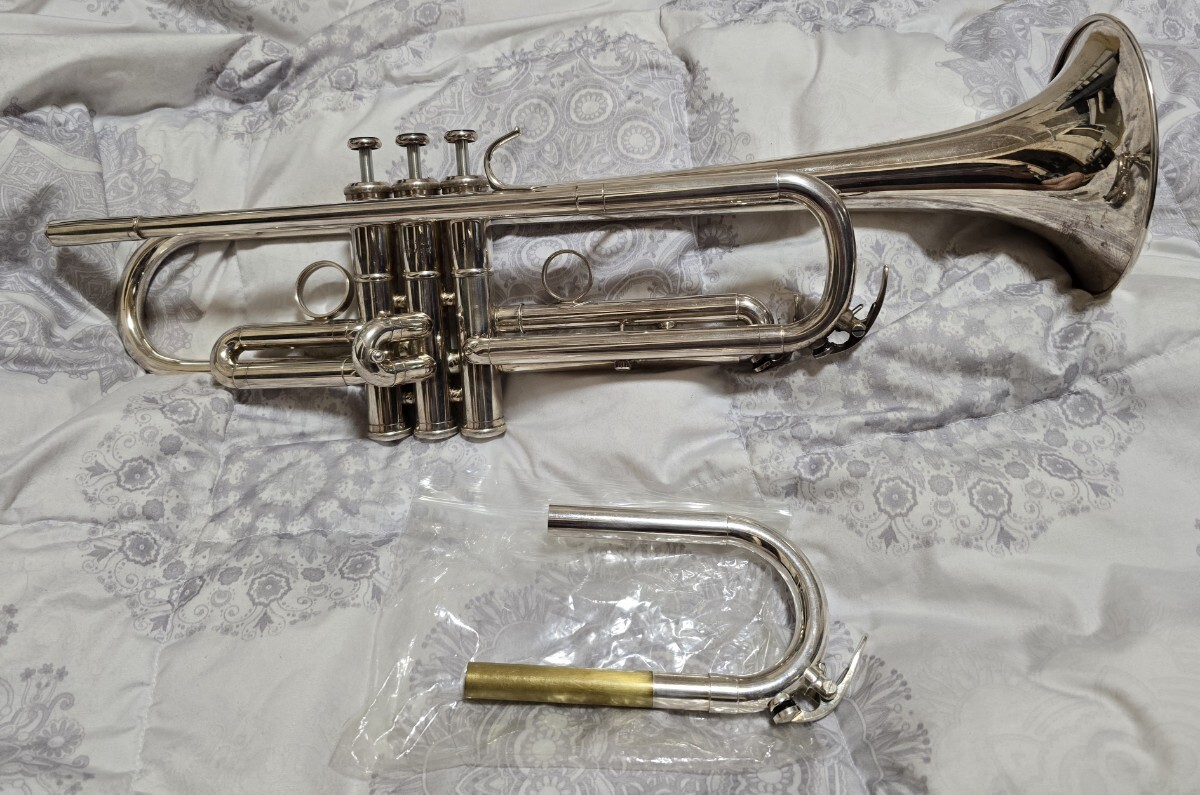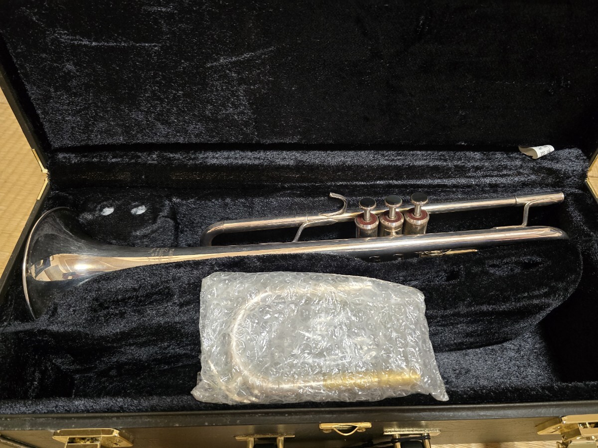 伝説のトランペット、YTR-83X です。2.5万円相当の別売でYAMAHA純正のラウンドクルークチューニングスライド付き、純正のハードケース(ダブル)付きです。