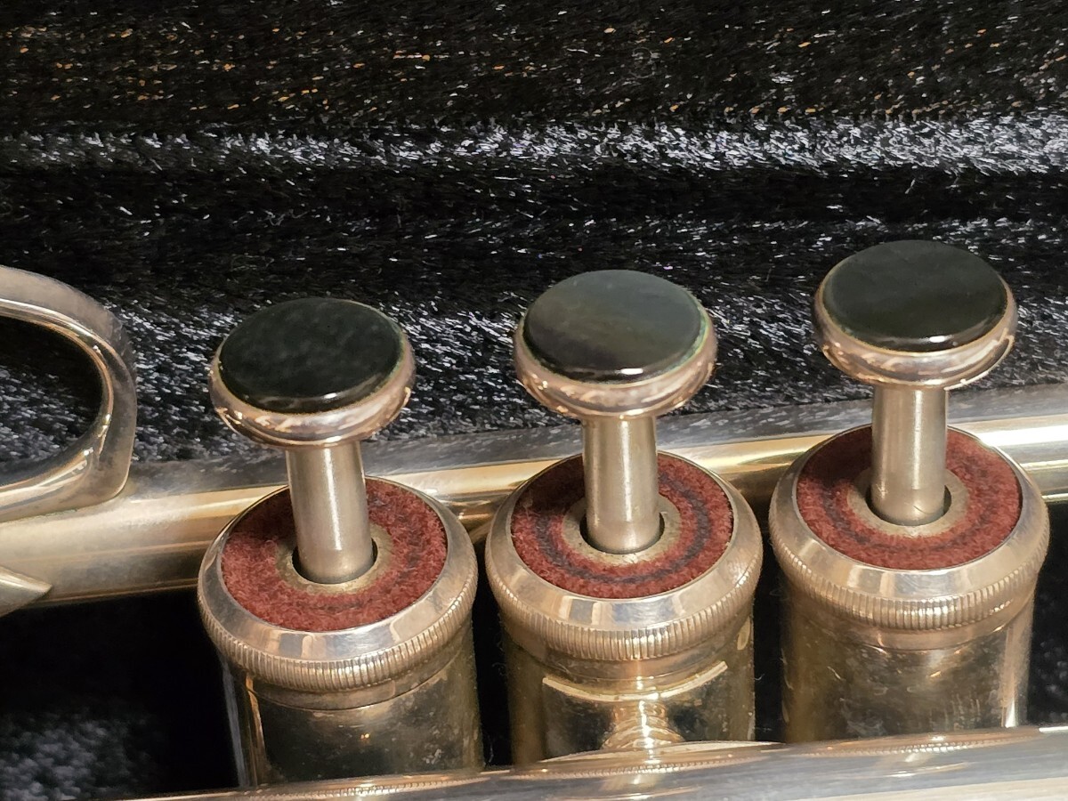 ・3番スライド、1番スライドは修理が必要です。取り外しはできますが、演奏中は動かせません。この問題が大きいためジャンク扱いとさせていただきます。この問題を除けば現役でバリバリ使える楽器です。