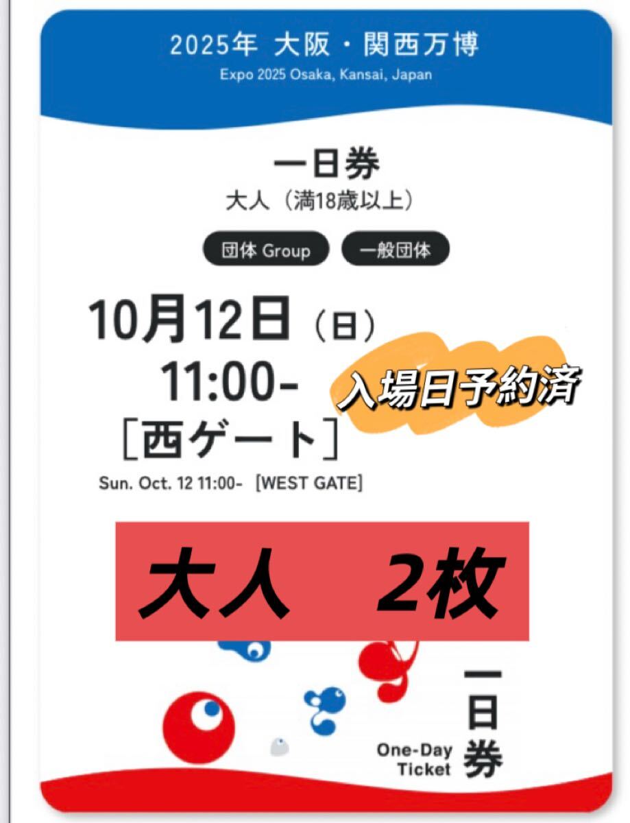 10月12(日)入場チケット(大人2枚)を出品いたします。