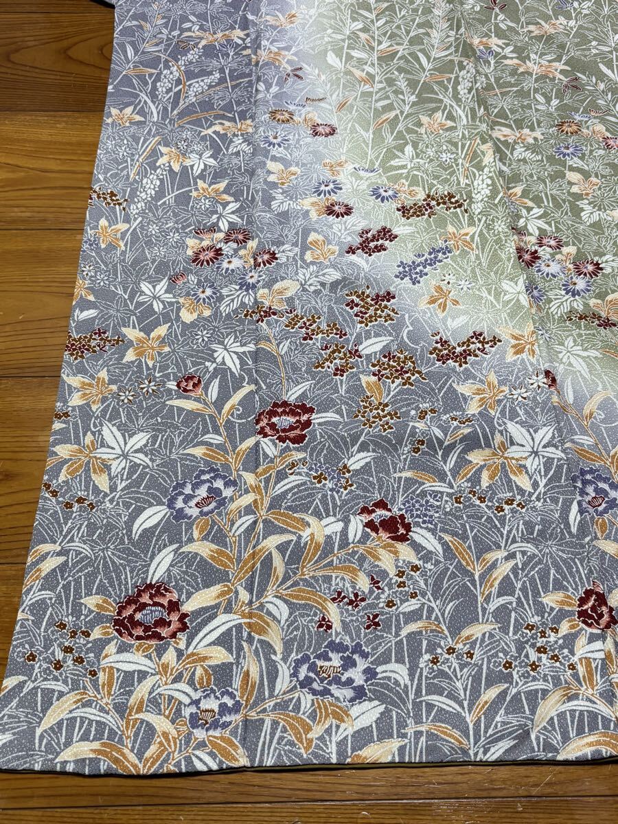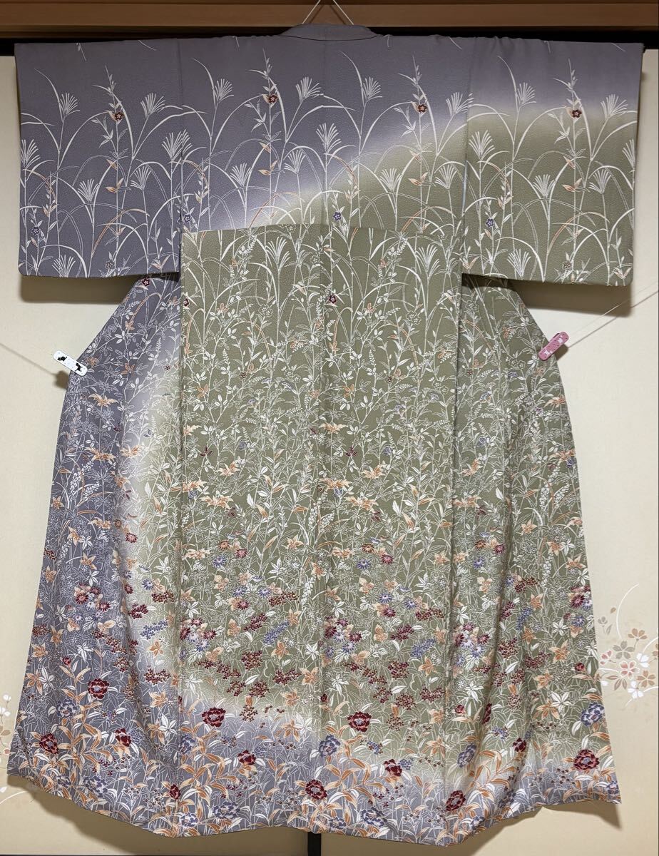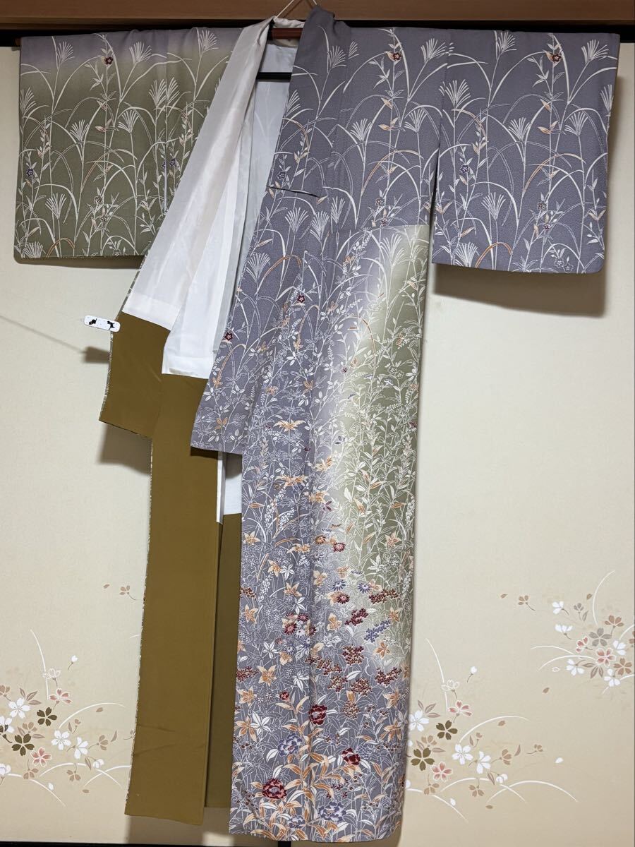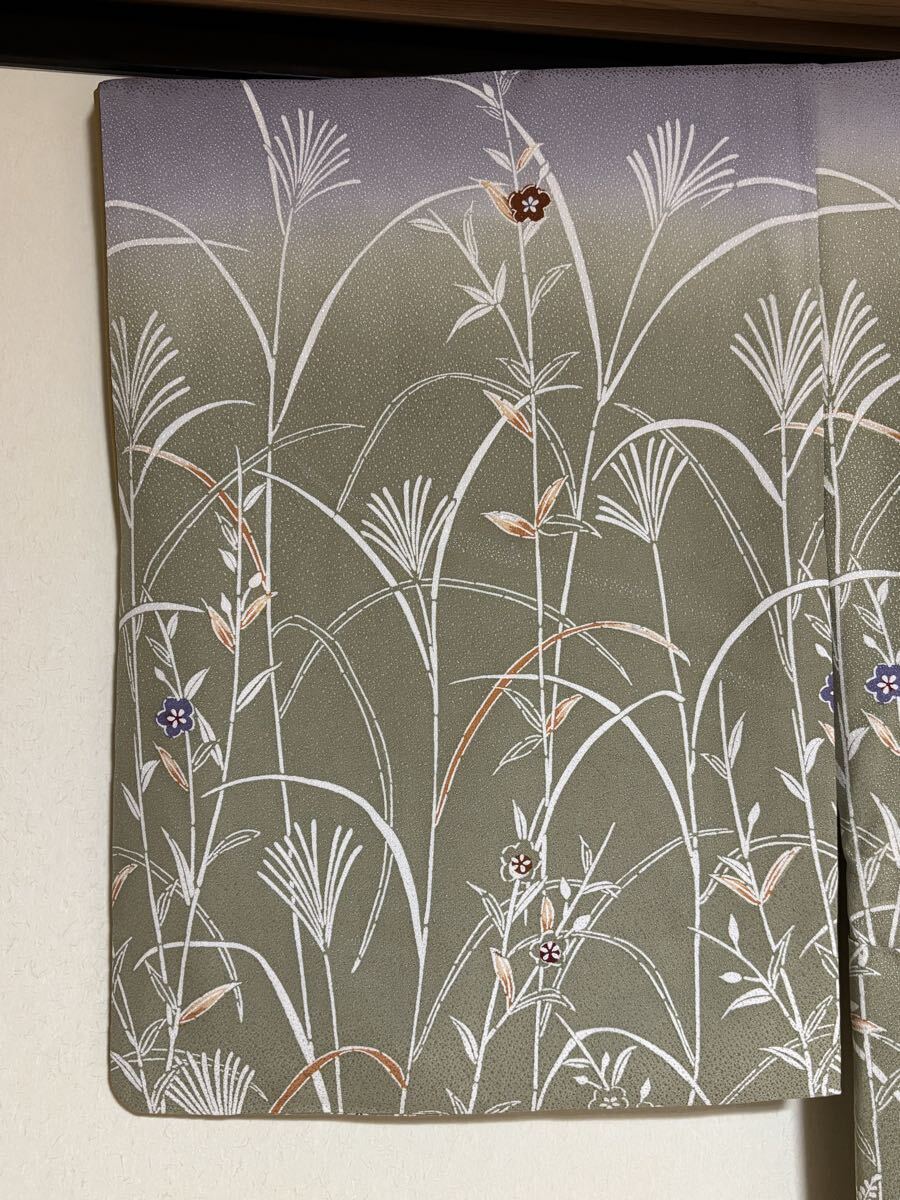 グレージュ系の優しい色合いに、ススキと花柄の模様が印象的な訪問着。軽やかな生地感で、上品な着こなしを楽しめる一着です。