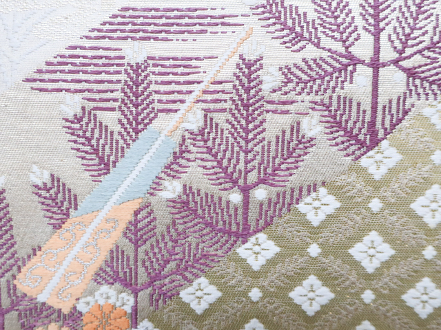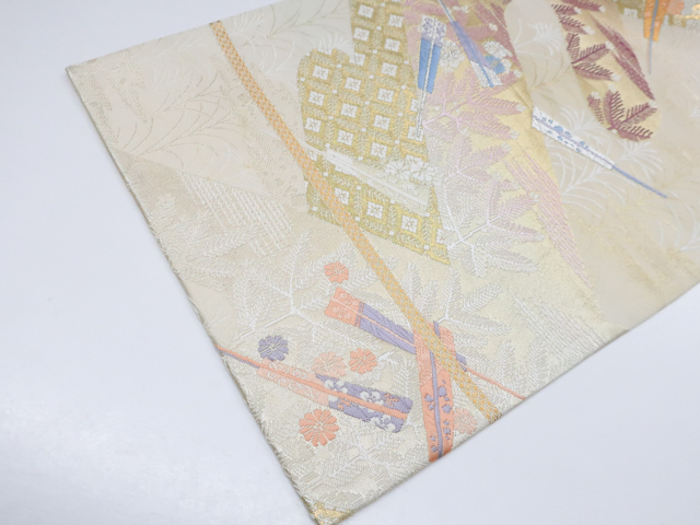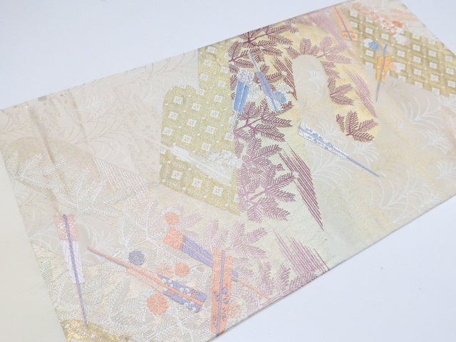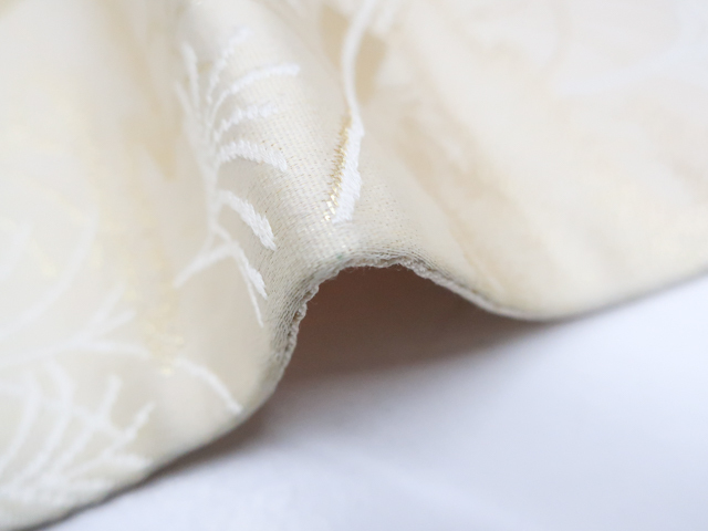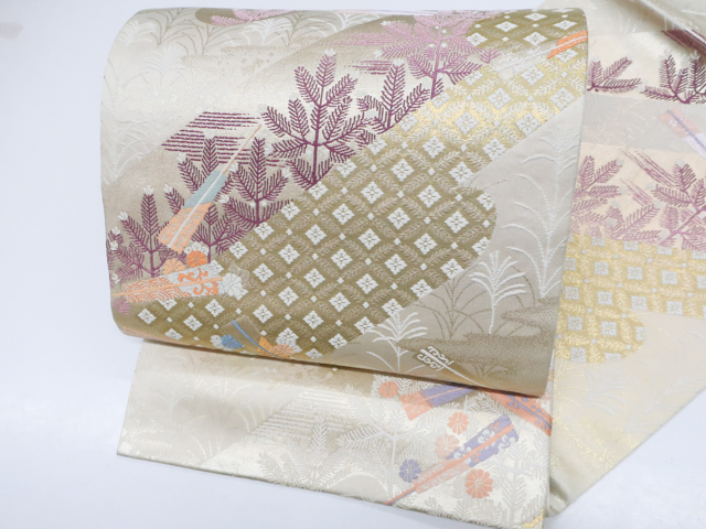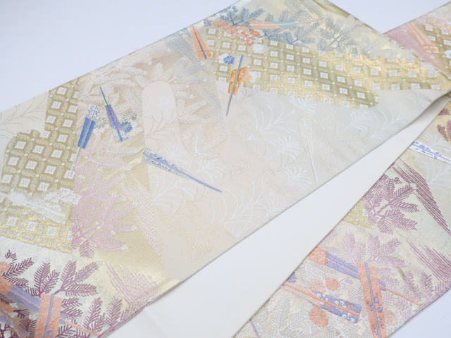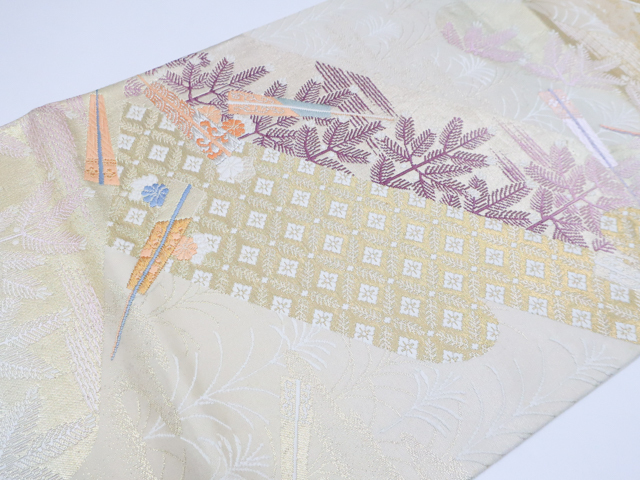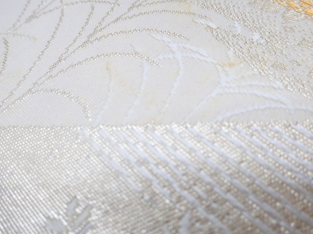 リサイクル商品の為、所々シミ・汚れがございますがご着用いただけると存じます。 地色は 薄金・生成です。 1枚目の画像が近いお色かと思われます。 素材は正絹です。 |