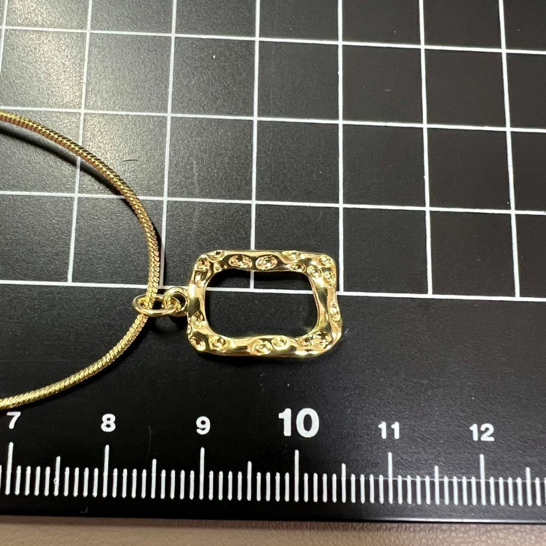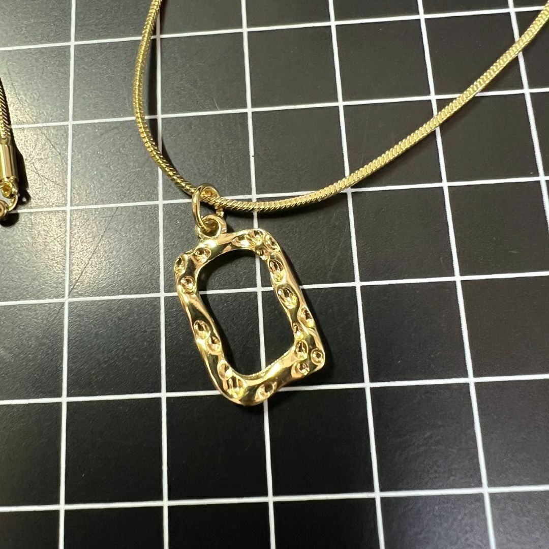 長方形のモチーフとチェーンネックレスの組み合わせ。