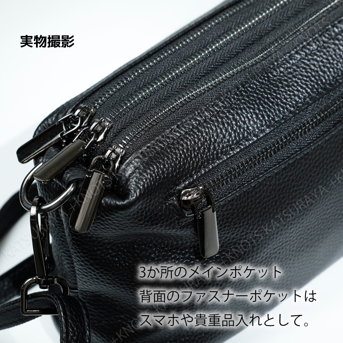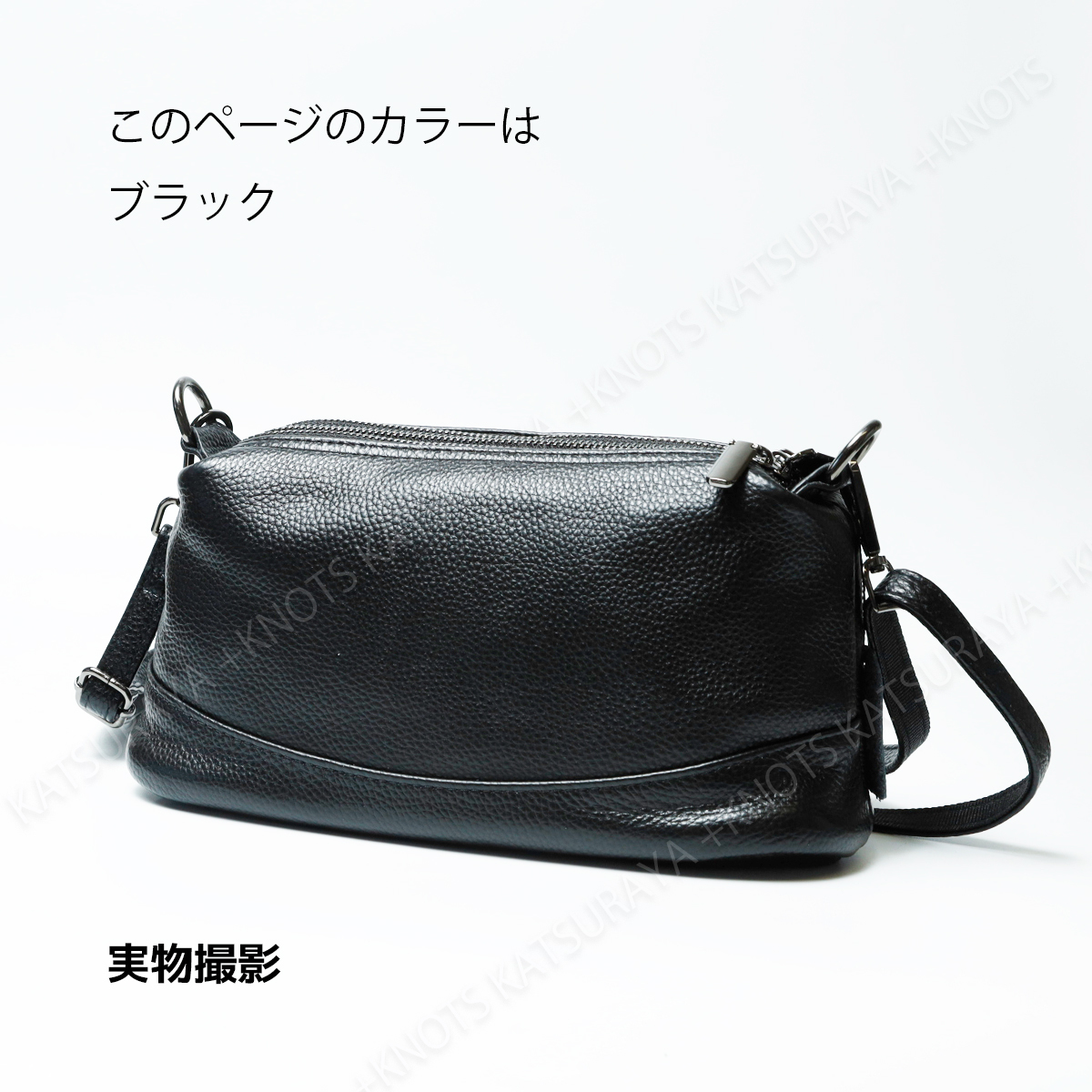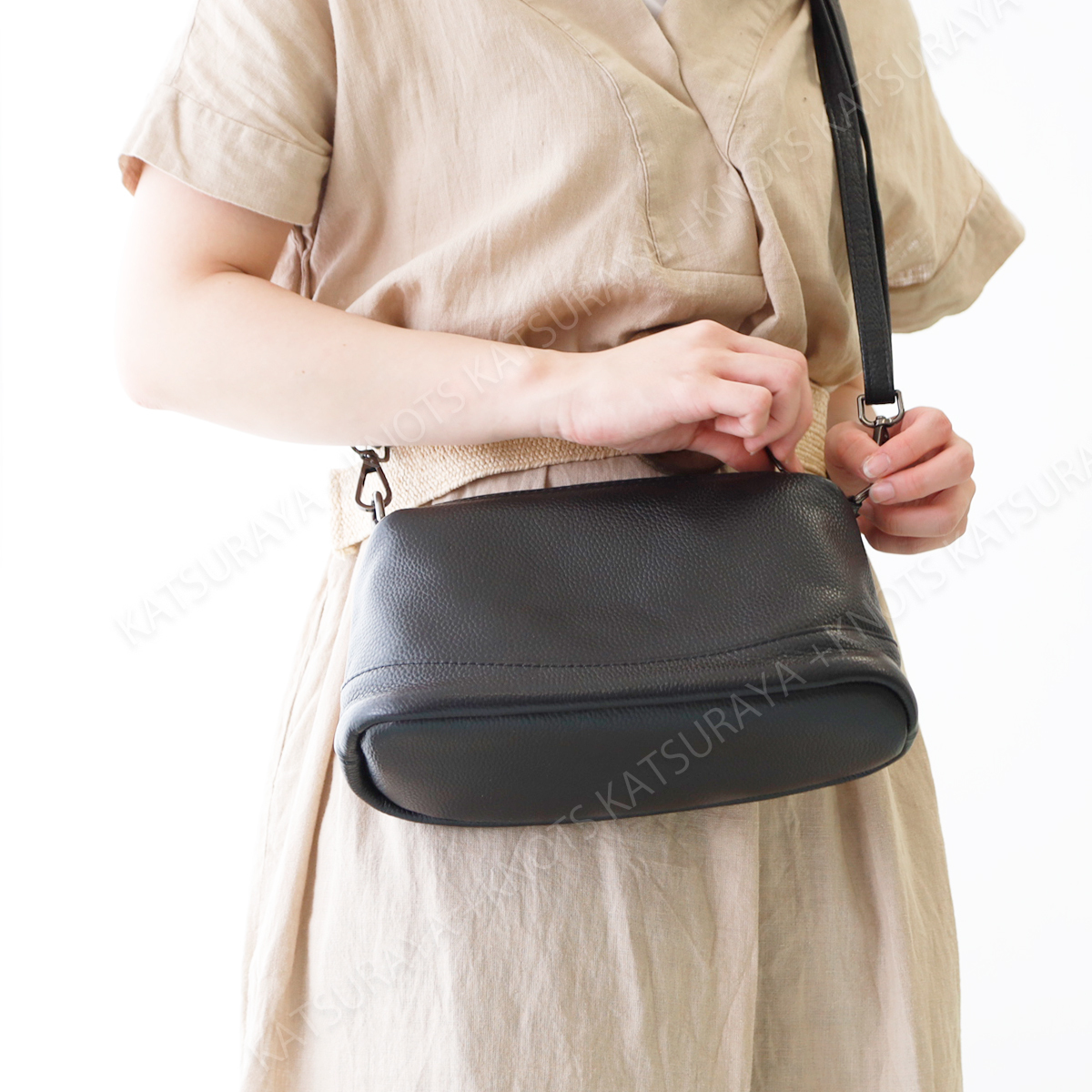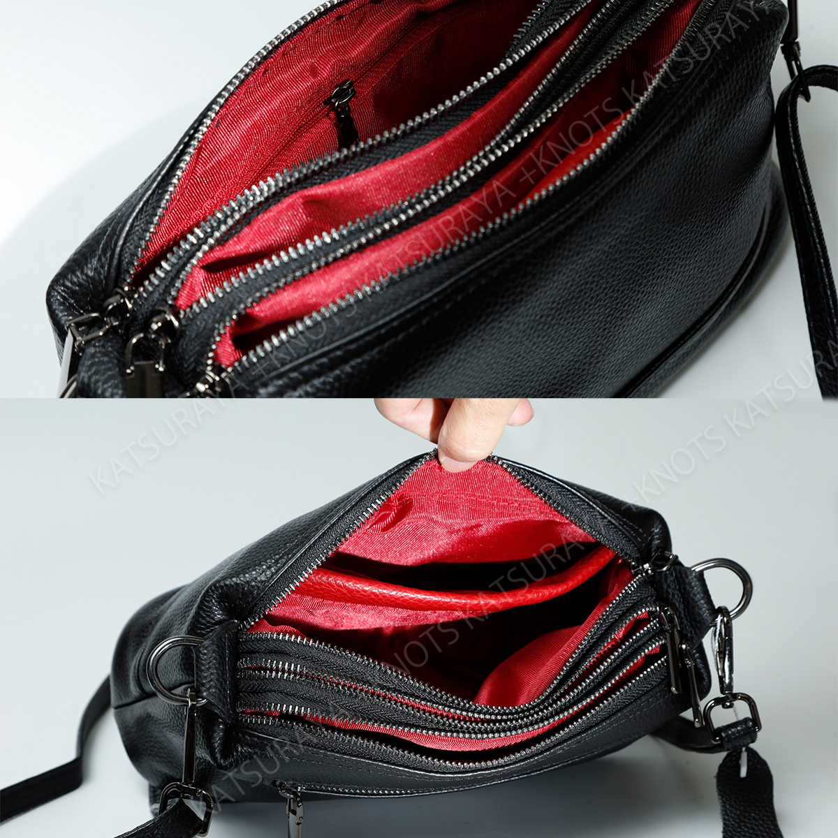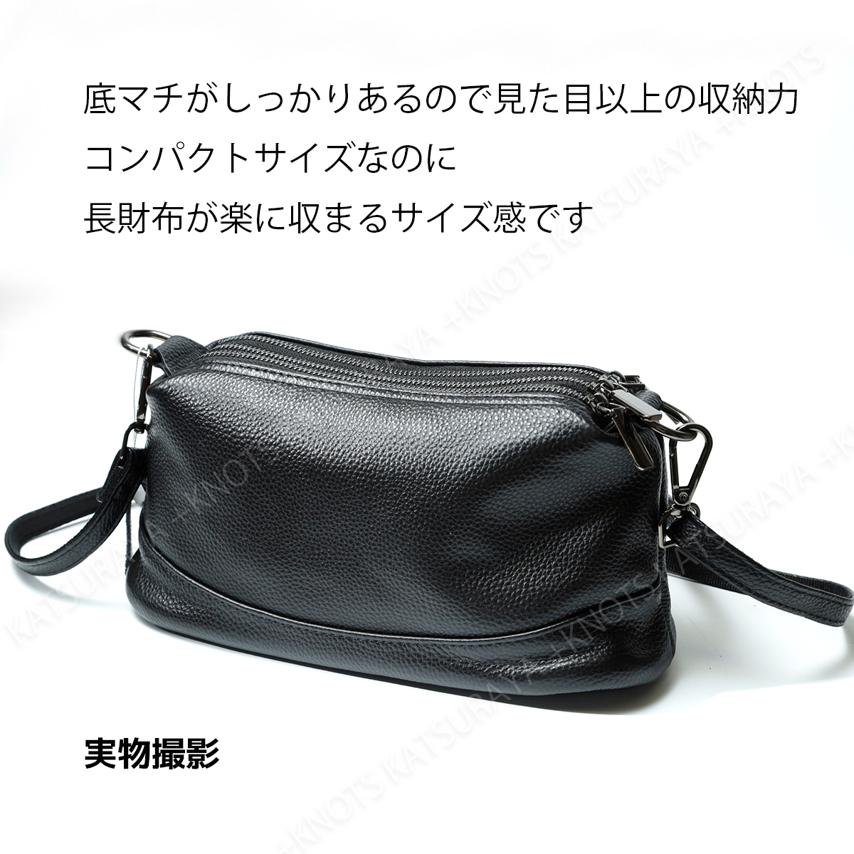 底マチが9㎝あり見た目以上に大容量、長財布もしっかりと収まる本革ミニショルダーバッグです。メインポケットは三層あり、それぞれ独立したファスナーを備えています。背面にもファスナーポケットがあり、スマホや貴重品の収納に重宝します。シボのある本革素材が全体に落ち着いた印象を与えます。